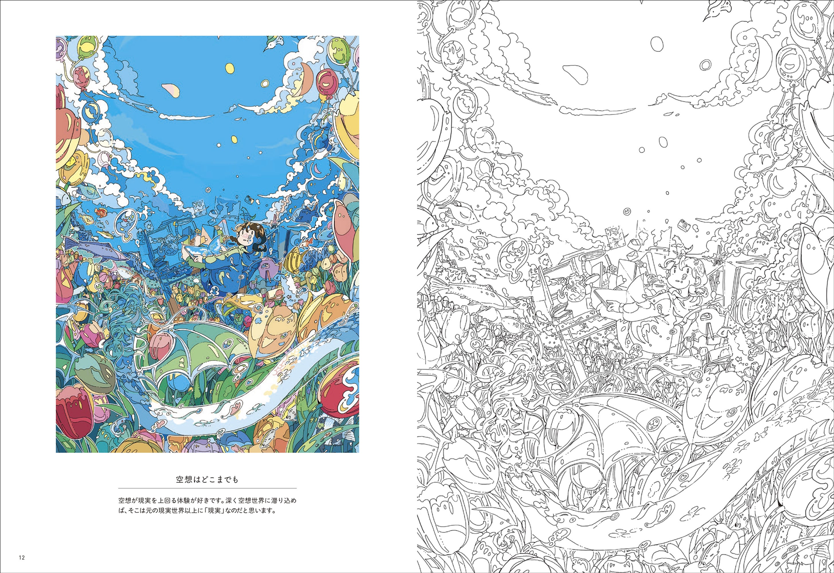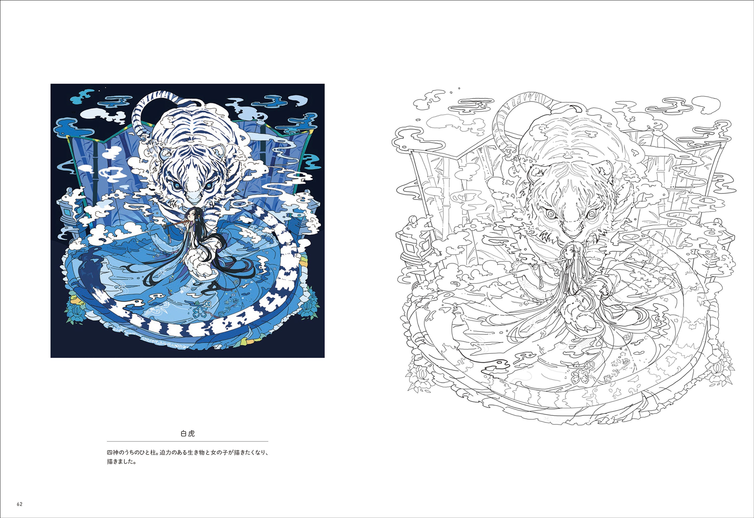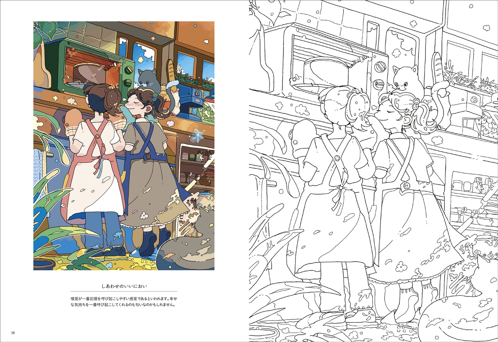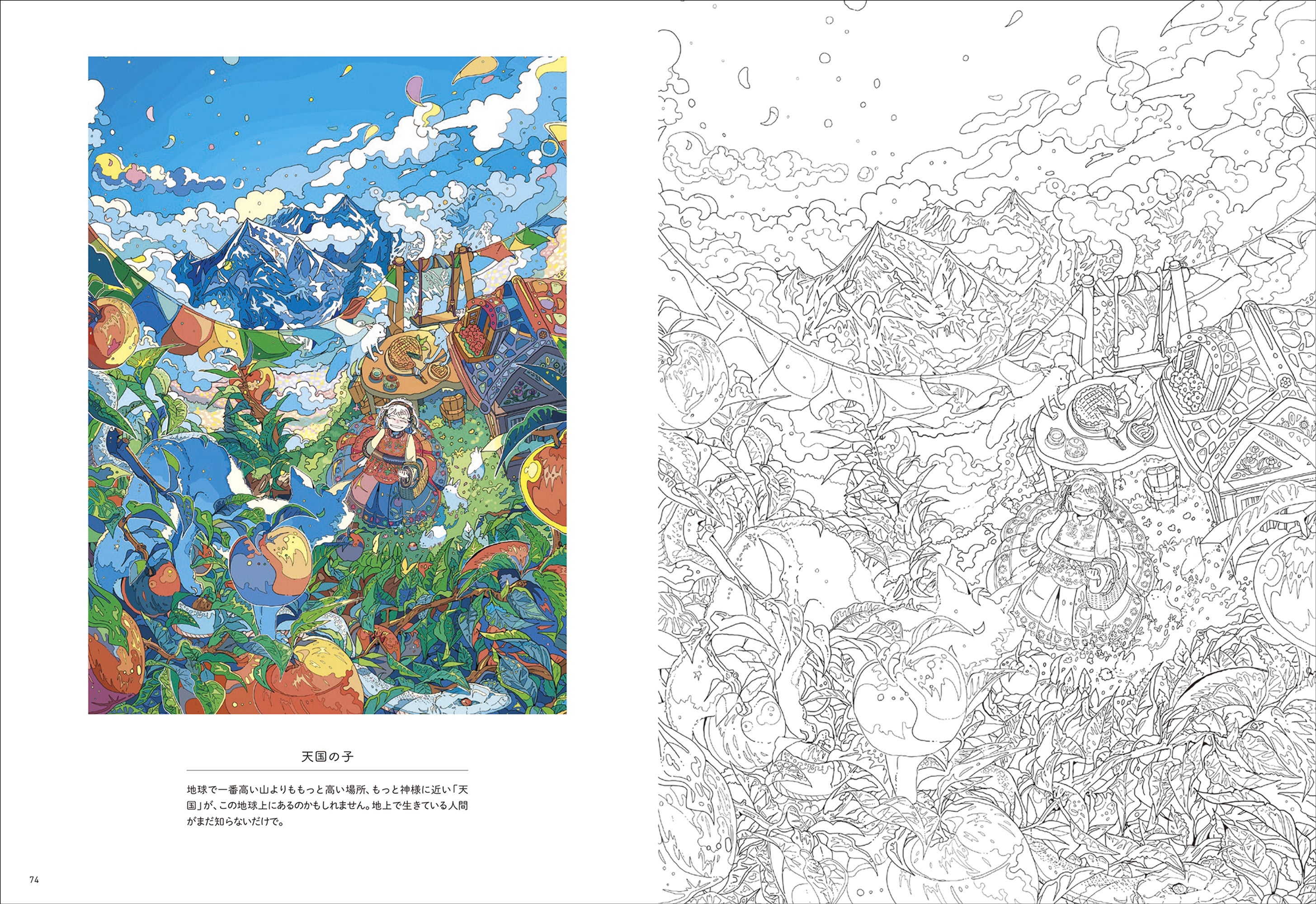 本書には、描き下ろしイラスト5点を含めた、全35点の塗り絵を収録。ならのによって美しく彩色された見本(元絵)と塗り絵を見開きで掲載しているので、見本を見ながら塗り絵を楽しめます。繊細で緻密な線画は、塗り応え抜群!