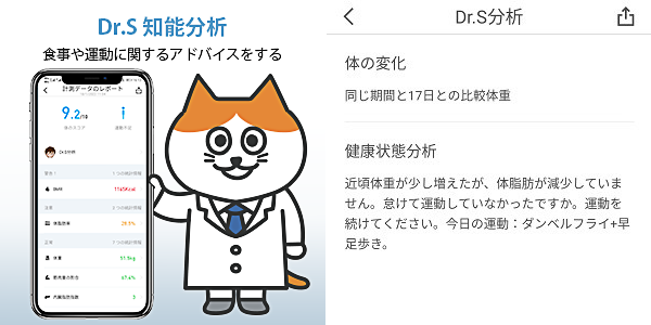 ⑤Dr. S知能飲食アシスタントは測定結果やデータ変化によって、体調改善のアドバイスをしてくれます。