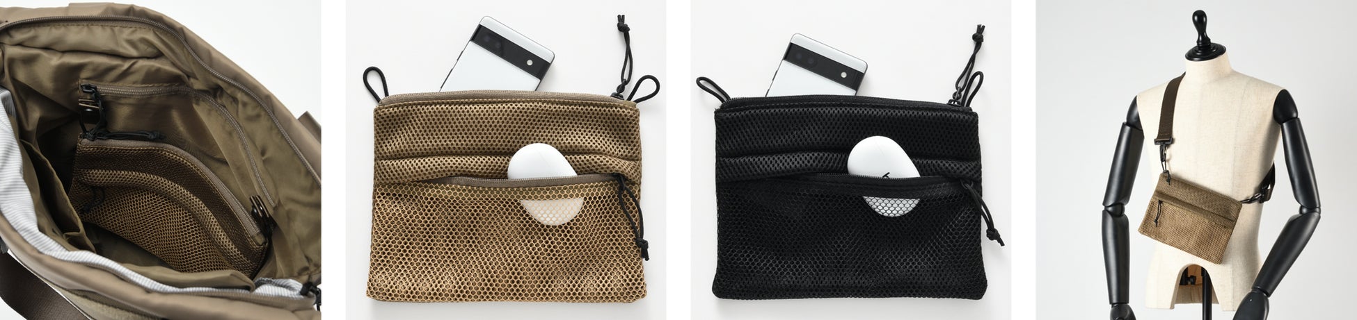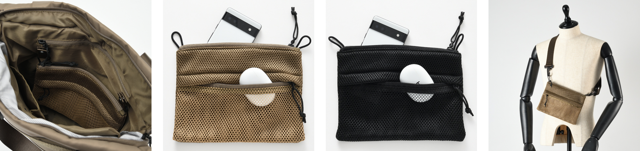 バッグの内ポケットとしてだけでなく、取り外してショルダーベルトを付ければミニショルダーバッグや整理用ポー チとしても使える3WAY仕様。