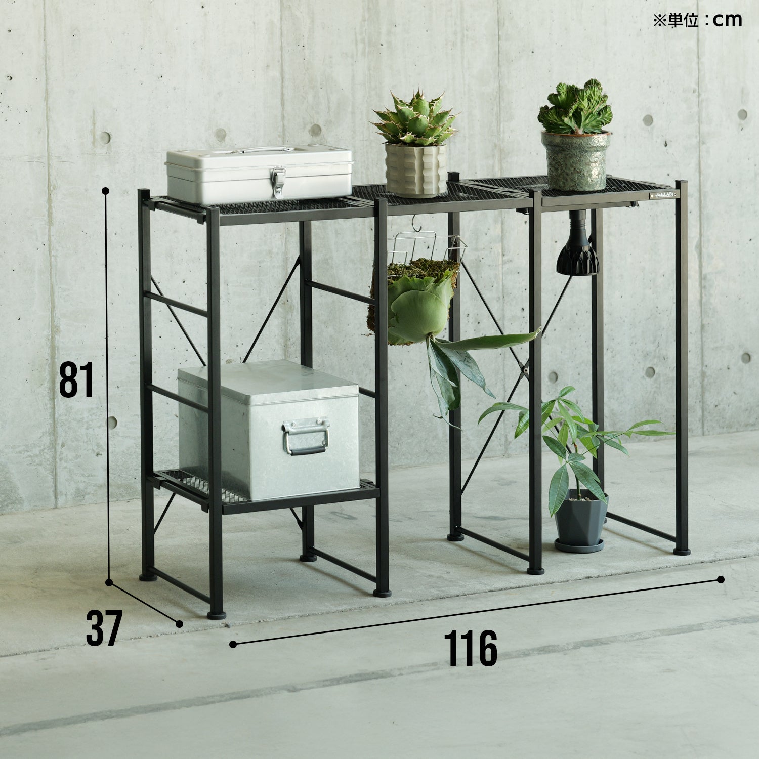 メッシュスチール製で通気性もバッチリ。鉢底が蒸れにくく、またライトの光やサーキュレーターの風が下段まで届きやすいよう配慮しています。メッシュの網目にフックをかければ、ビカクシダなど吊り下げタイプの植物を飾ることも可能です。