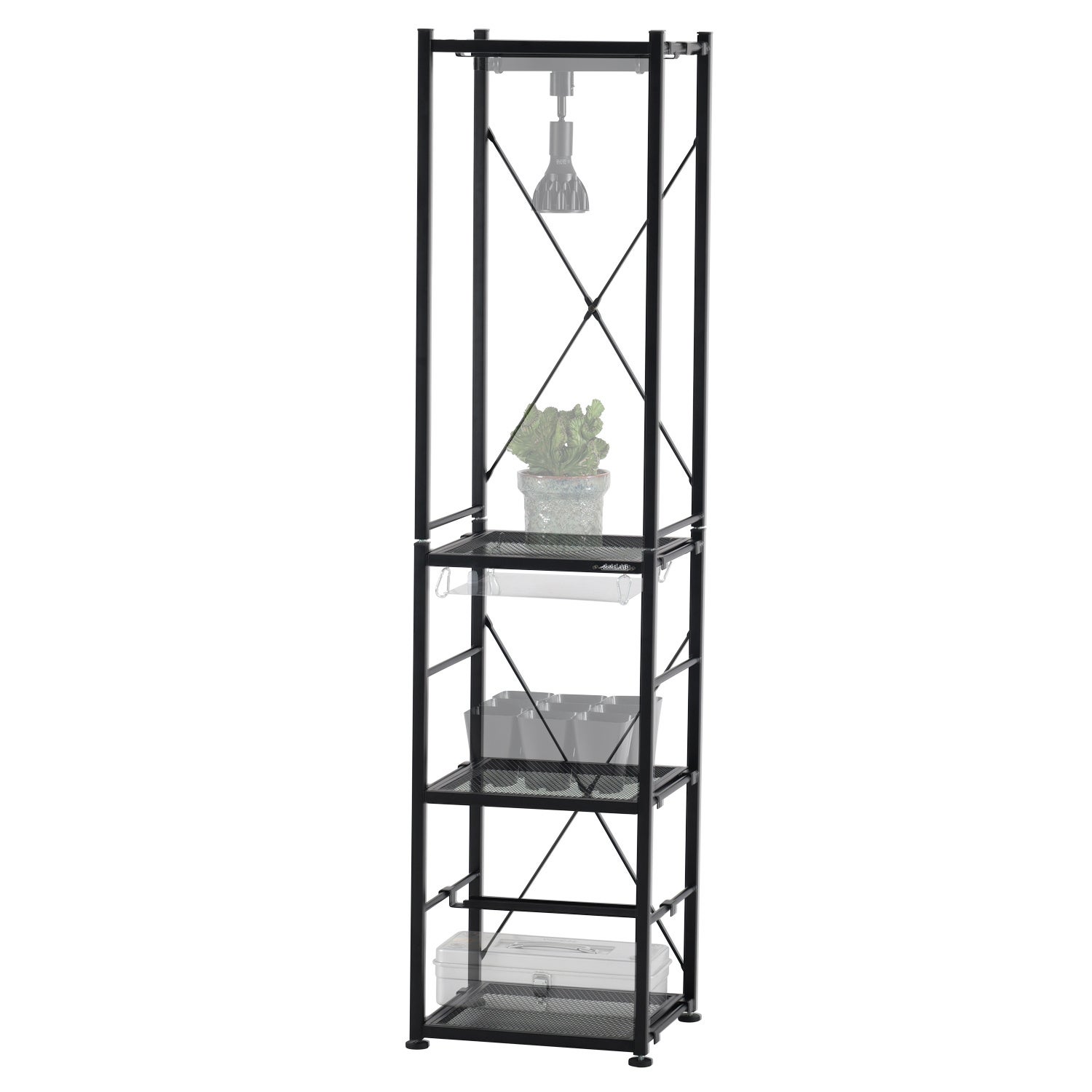 35cm四方のメッシュ棚板は、お気に入りの一株を飾るのに最適。縦の空間を活かして、省スペースながら3段分の収納容量を確保しています(接地面積:幅41×奥行き37cm)。市販の育成ライトと組み合わせることで、植物の健やかな成長を促しながらハッと目を引くような演出が可能に。特別な宝物をショーケースに飾るかのごとく、ひとつの鉢にフォーカスした魅せ方をすることができます。植物の個性や美しさがより引き立つよう、無駄のないシンプルなデザインにもこだわりました。