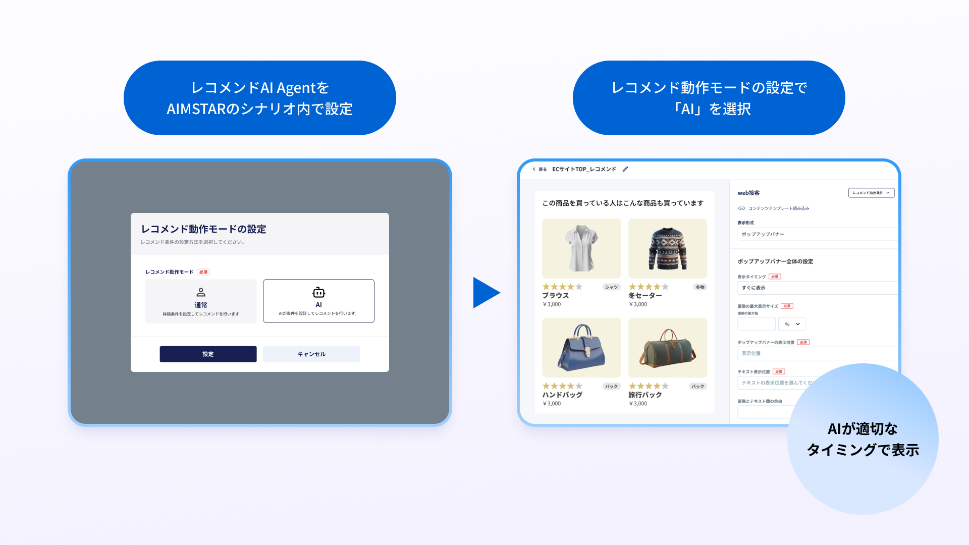 高度なAIロジックも、管理画面からプルダウンで選択するだけで設定が完了します。エンジニアに依頼することなく、マーケター自身の手で即座に施策を実行・改善できるUI/UXを実現しました。