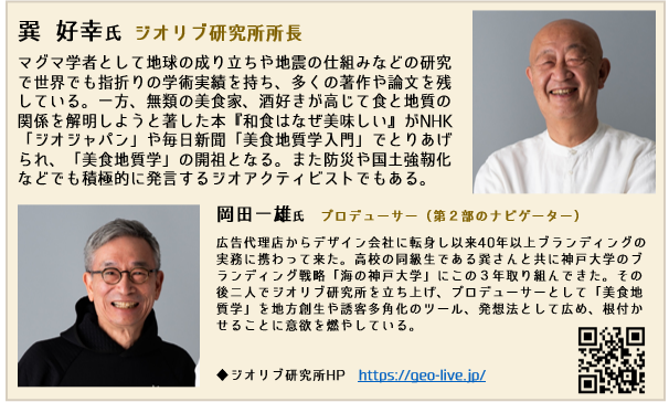 「美食地質学」を提唱される地球科学者でジオリブ研究所所長の巽 好幸先生からの話題提供をひとつの手掛かりに、各地域にて日々活動されている水先案内人や、毎月日本海3県の魅力伝道師として訪問活動中のアンバサダーとの掛け合いも楽しみながら、地域の固有の資源や食文化を紐解くプログラムです。ぜひロケーションや交流も楽しめる現地会場や、アーカイブ動画視聴にてご参加ください。