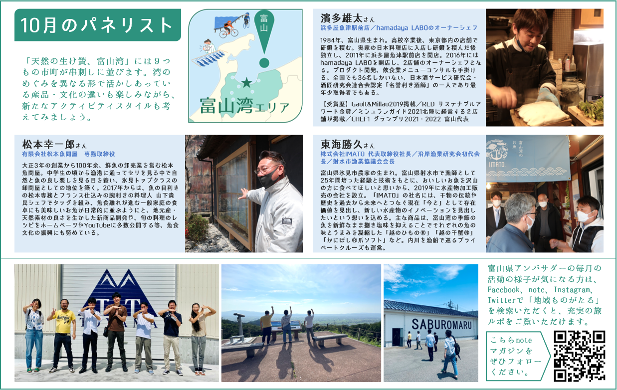 10月15日(土) 14時~は、JR富山駅前に2022年3月に開業した商業施設・MAROOT(富山県富山市)1階の、富⼭の”美”を味わう⽇本酒バル「バール・デ・美富味(みとみ)」を会場として、「天然の生簀・富山湾が育む魚介と富山のお酒のマリアージュ」のものがたりを紐解きます。