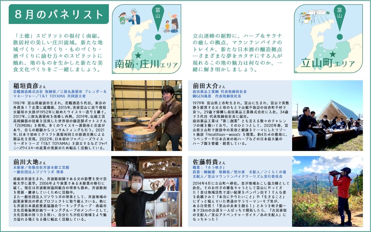 8月27日(土) 15時~は、富山県立山町の美しい原風景の中に佇むビレッジ「ヘルジアン・ウッド」の The Kitchen を会場として、あたり一面に広がる水田風景、立山連峰から富山湾へと繋がる雄大な風景と、地域の水先案内人との対話を楽しみながら、「富山のジオが育んだ水と木と食と地場産業/富山にとって立山とはなにか?」に焦点をあてていきます。