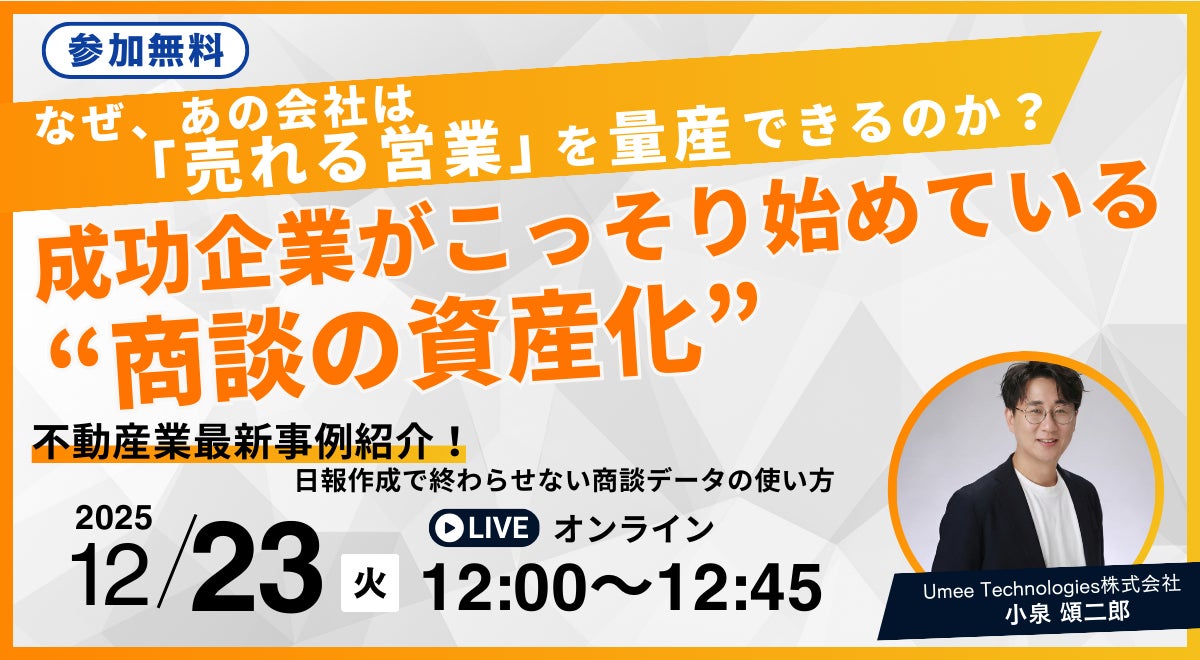 組織を変革するインサイトアナリシス™「Front Agent」を開発・提供するUmee Technologies株式会社(本社:東京都調布市、代表取締役:新納 弘崇、以下「ユミー」)は、不動産業界の営業職およびマネージャー層を対象とした無料オンラインセミナー「なぜ、あの会社は『売れる営業』を量産できるのか? ~成功企業がこっそり始めている“商談の資産化”~」を開催いたします。 本セミナーでは、従来の日報管理では見えなかった「商談現場の真実」をAI技術で可視化・分析し、組織全体の成約率向上につなげる最新の事例とノウハウを公開します。