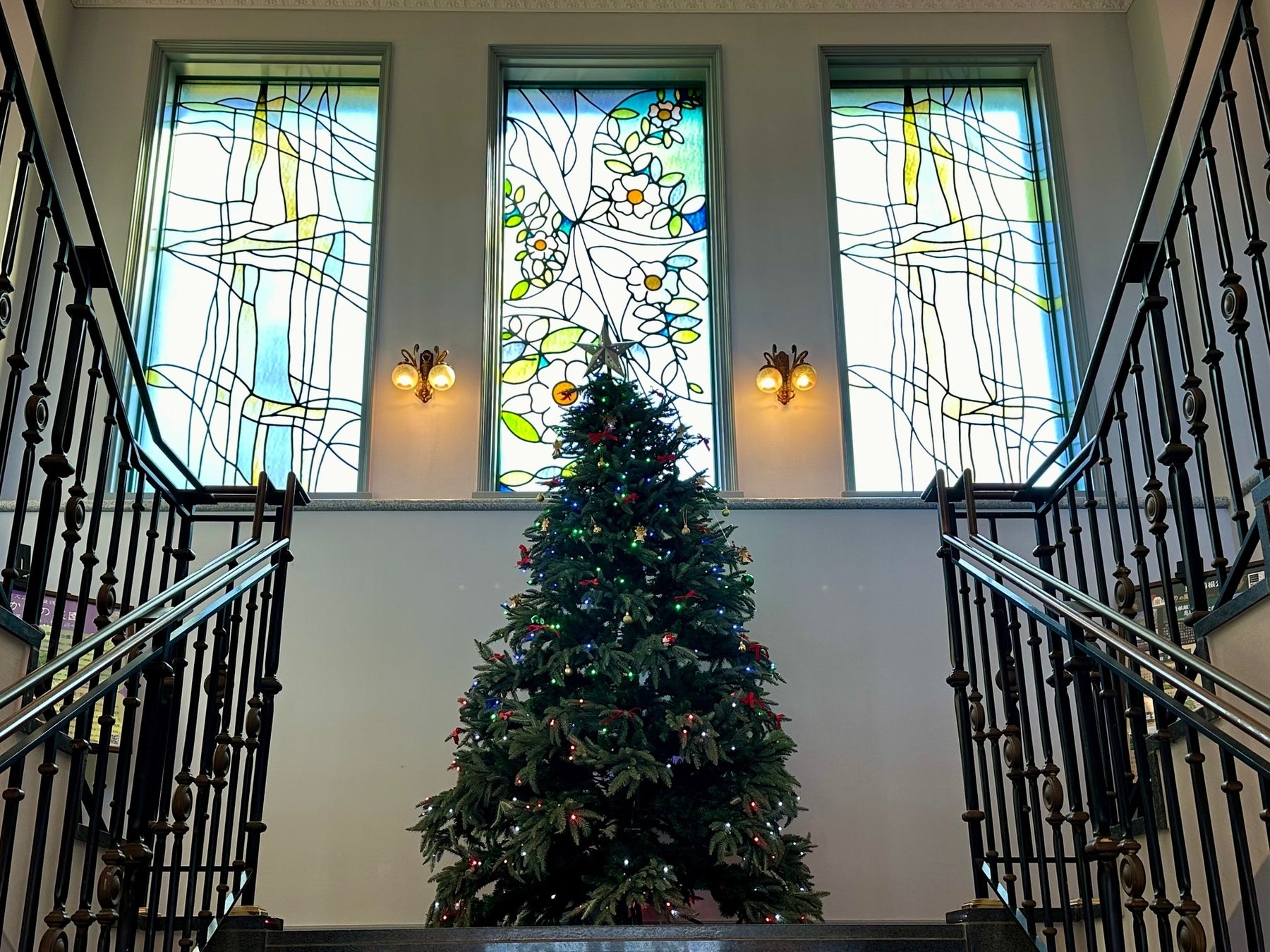 晴れた日には、クリスマスツリーの後ろのステンドグラスに太陽の光が差し込み、幻想的な雰囲気が漂います。