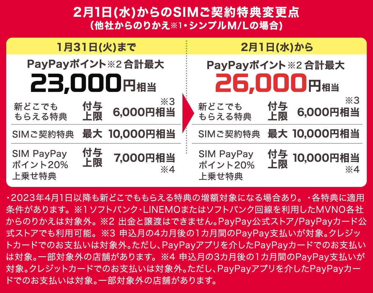 今回、この特典の好評を受け、「SIM PayPayポイント 20%上乗せ特典」の付与上限7,000円相当を、2月1日(水)から3月31日(金)の期間限定で、他社からのりかえの場合10,000円相当に変更し、「新どこでももらえる特典」と「SIMご契約特典・SIMご契約特典プラス」とあわせて、合計最大26,000円相当のPayPayポイントが還元されるようになりました。