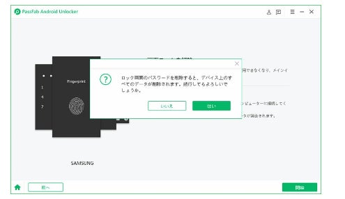 Step3: 「ロック画面のパスワードを削除すると、デバイス上のすべてのデータが削除されます。続行してもよろしいでしょうか。」というメッセージが表示されます。ここで「はい」を選択し進みます。