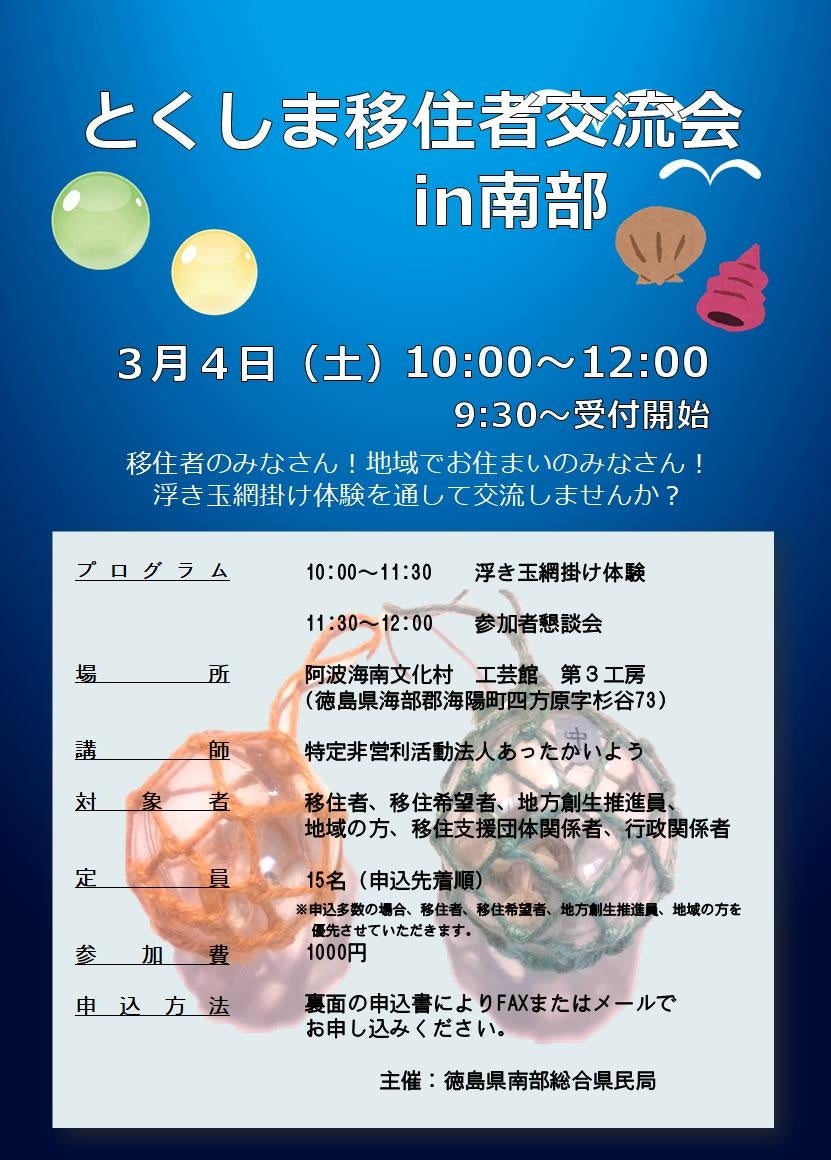 令和5年3月4日(土)徳島県南部圏域の海陽町において、 移住者、 その支援を行う民間団体、 行政関係者、 地域の方々総勢11名が、浮き玉網掛け体験や、 移住者共通の悩みや移住後の感想等の意見交換を通じて、お互いの交流を深める「移住者交流会 in 南部」を開催しました!