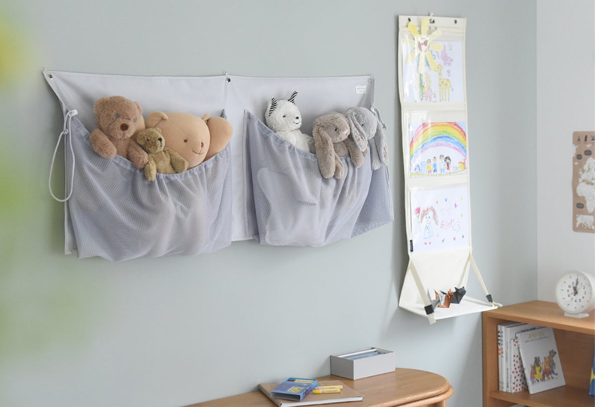 壁の空きスペースを有効活用しながら、ぬいぐるみの収納場所を作れる新提案。