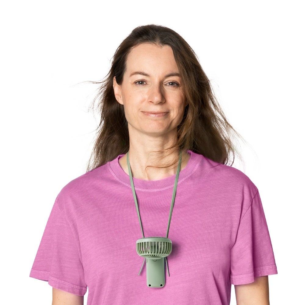 首にかけて使用でき、ファン部分を曲げることで顔に送風できる仕様。両手が空くため、作業中や移動時にも便利です。ストラップ&USBケーブル付き