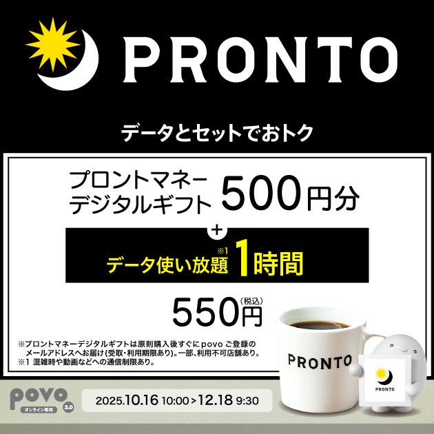 KDDI、沖縄セルラーは2025年10月16日から、povo2.0の「コラボトッピング」として、「プロントマネーデジタルギフト500円分」と「データ使い放題(1時間)」(注)がセットになったトッピングを550円で提供します。