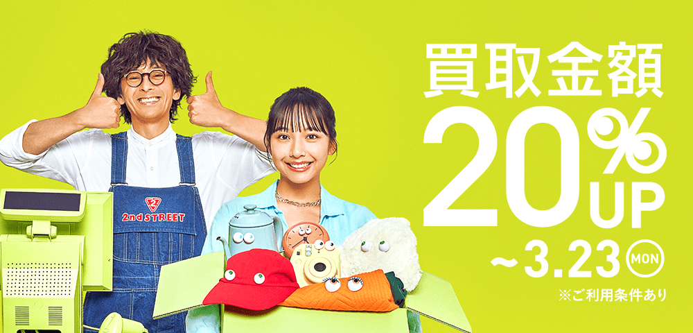 株式会社ゲオホールディングス(本社:愛知県名古屋市中区、代表取締役社長執行役員:遠藤結蔵)のグループ会社である株式会社セカンドストリート(本社:愛知県名古屋市中区、代表取締役社長:一戸綱樹)は、2026年3月6日(金)から3月23日(月)までの期間、全国約920店舗のセカンドストリートと宅配買取にて、買取金額が全品20%アップする買取キャンペーンを開催します。