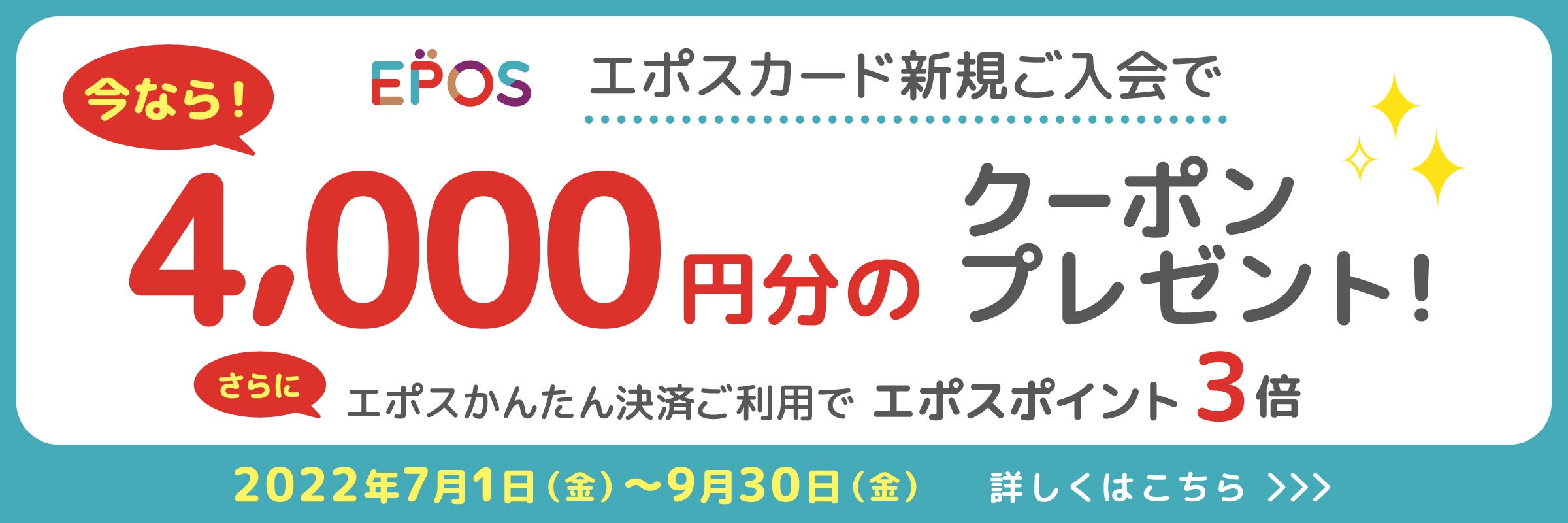 7月1日(金)から9月30日(金)まで、エポスカード新規入会で4,000円分のクーポンプレゼント