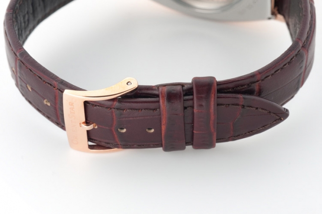 文字板はピンクゴールドカラーと相性の良いシルバーカラーを採用し、光沢感のあるしっとりとした質感に仕上げました。この上品な文字板に絶妙なバランスで配置されたローマインデックスと青い眼鏡針の組み合わせで、腕元を落ち着いた雰囲気に演出しております。さらに、ダイヤル中央部の型打ち模様で立体感を醸し出し、オフセットされた小秒針が良いアクセントとなって、上品で存在感のある文字盤に仕上げました。ピンクゴールドカラーに相性抜群のこげ茶色のカーフバンドは、剣先に向かう形状を強く絞り込むことで時計全体を繊細な印象に仕上げております。