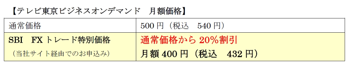 これにより、当社にて口座を保有されるお客様はテレビ東京がご提供されている動画配信サービス「テレビ東京ビジネスオンデマンド」(※)を当社経由にてお申込みいただくことで、同サービスを当社特別価格(下表ご参照)にてご利用いただくことが可能となります。