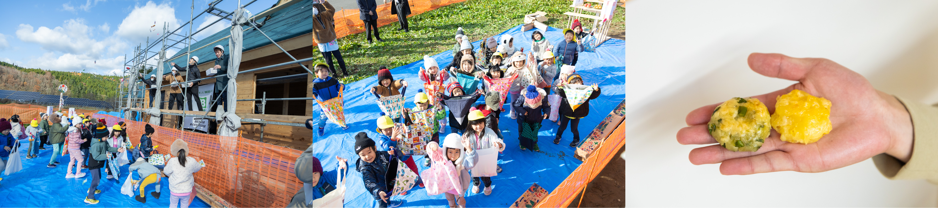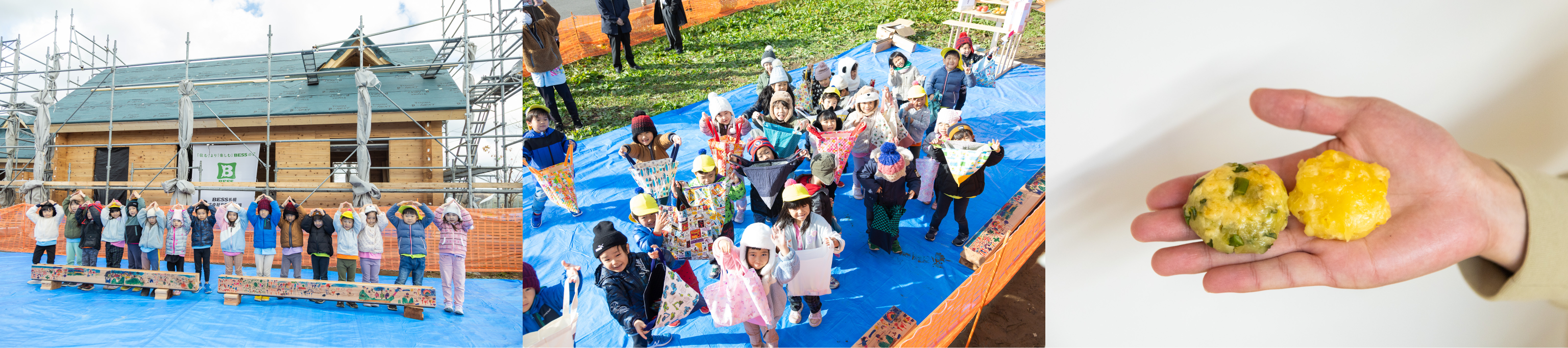 上棟した2棟のネーミングとカラーは厚沢部町の名産品にちなんだ「とうきびの家(黄色)」と「アスパラの家(緑)」を予定しています。今回の上棟式ではとうきびパンとアスパラパン、お菓子を、こどもも楽しめる餅まきならぬ”パン巻き”として、認定こども園はぜるの園児たちと行い、大盛況となりました。
