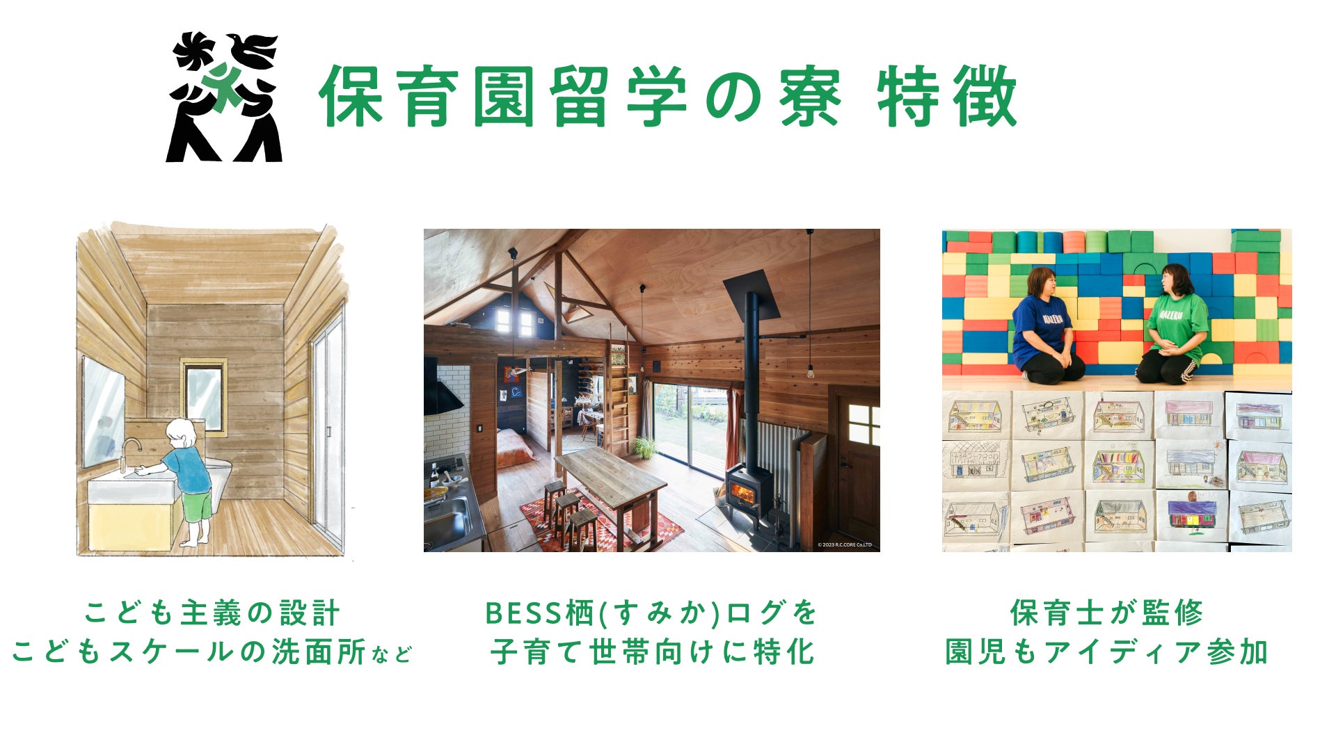 「こども主義」を設計思想に、保育園留学で来るご家族に対して、都市生活では味わえない「こどもの創造性と大人の常識をはばたかせる家 」というコンセプトで2棟設計。保育園留学先の認定こども園はぜるの園児たちからアイディアを募り、こどもサイズの洗面台設置や、保育士の安全監修など、未就学児の子育て家族に特化した家となる予定。2024年春の完成・2024年6月からの受入を予定。今後賃貸としても利用可能となり、保育園留学から移住へとつなぐインパクトを拡充します。完成前から既に2024年度募集枠の半数以上が満枠となっており、注目度の高さが伺えます。