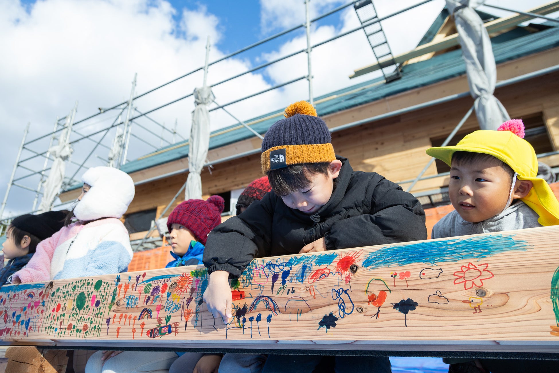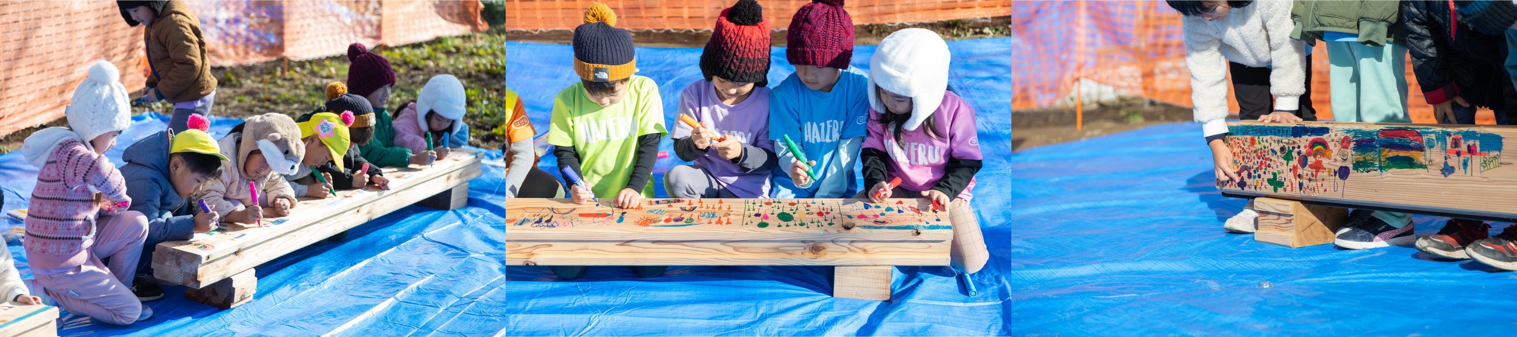 保育園留学の寮は、都市生活では味わえない「こどもの創造性と大人の常識をはばたかせる家 」というコンセプトで、大人都合ではなく、こども主義でこどもがはばたくようにのびのび過ごせる設計を予定しています。設計コンセプトに則り、認定こども園はぜるのこどもたちがエキストラログ(予備木材)に「空」をテーマしたお絵描きを披露。こどもたちは創造性をはばたかせ、虹・風船・ドクターヘリなど思い思いの空をのびのびと表現し、完成にむけた願掛けを行いました。