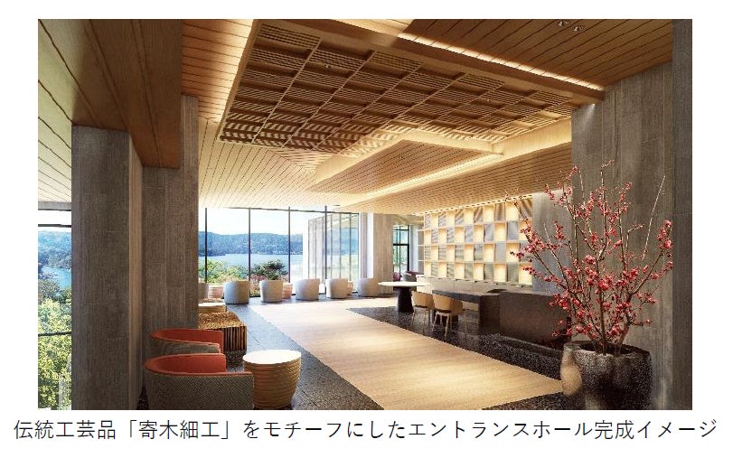 また、箱根の自然から生まれた伝統工芸品「寄木細工」にも注目しており、お客様をお迎えするエントランスホールやアライバルラウンジでは「寄木細工」をモチーフにした木々が折り重なったデザインを採用し、地域ならではの文化に触れられる空間を創出する予定です。