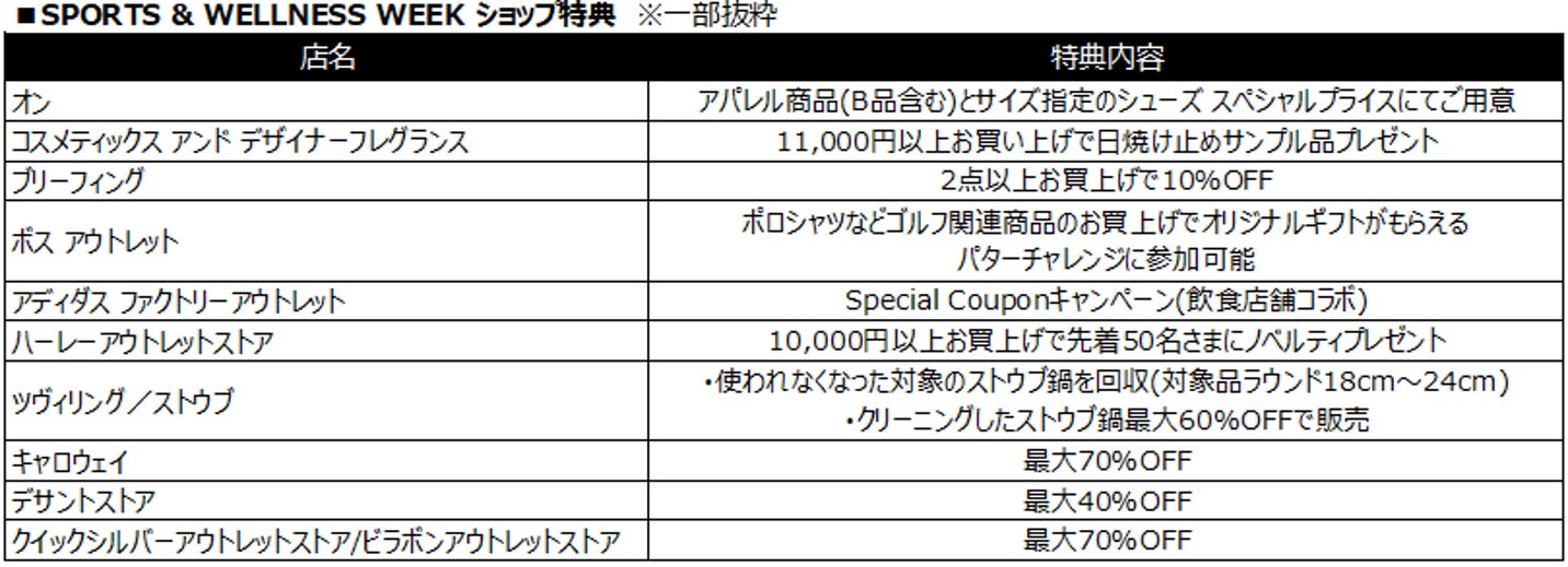 三井アウトレットパーク 横浜ベイサイドでの初開催となる「SPORTS & WELLNESS WEEK」期間中、施設出店店舗によるスポーツや心と身体の健康(ウェルネス)に関連したアイテムや今だけのおトクな特典、サービスなどをご用意しております。