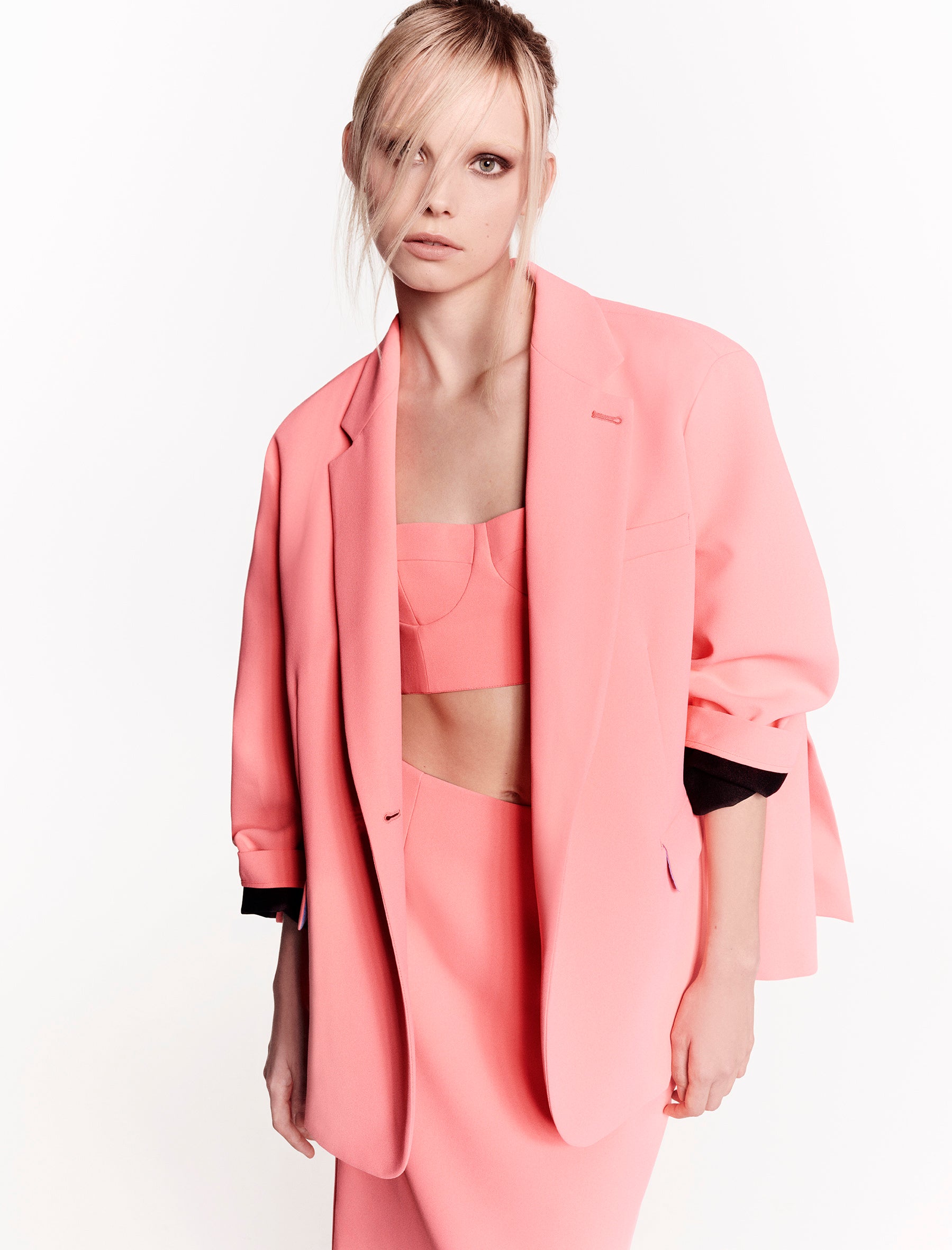 “再構築”を意味する今回のコレクションでは、裏地や袖のないコートは、ブレザーやドレス、またはスカートやコルセットなどに姿を変え、コートも注目を集めるアイテムへ。そしてビスチェドレス、テーラードパンツ、ペンシルスカートなどのクラシックなアイテムを、遊び心とインパクト溢れるスタイルへと昇華させます。目を引くカラーパレットは、ピンク、シトリン、オレンジのネオンカラーです。