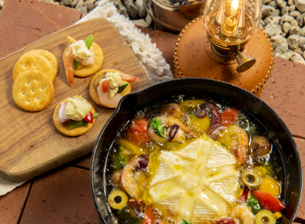 とろけるチーズにリッツクラッカーをつけたり、割ってアヒージョに浸したり。白ワインに合わせたいキャンプ飯です。