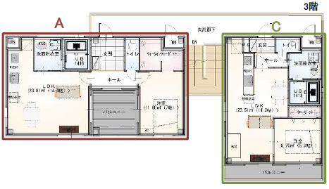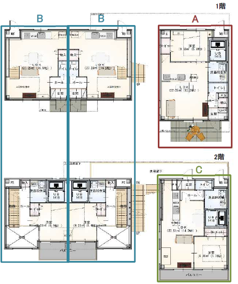 新商品『こもれび』は、カップルや新婚を中心とした、20~30代の二人暮らし世帯をターゲットに、部屋の種類を3タイプ用意しました。寝室とリビングが独立した1LDKを基本とした単身者や新婚世帯が暮らしやすいプランの商品で、2階がメゾネットになっている吹き抜け(2戸)、テラス・バルコニータイプ(1、3階に各1戸)、窓辺タイプ(2、3階に各1戸)で、それぞれの場所から中庭を感じ取れるようになっています。また、鉄骨造の利点を活かした柱のない吹き抜けや、家事動線などこだわりの部屋作りができるため、差別化を図った賃貸住宅として、賃貸経営を行うオーナー様にとっても長期間の安定経営を