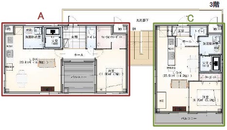 ◆暮らしのイメージ:3階はLDK、洋室と段差がなくなるよう奥行きが広いバルコニーを設置し、床面にデッキを置くことで中庭が望められる部屋となり、リビングと一体利用可能にしました。また1階のテラスは、ガーデンテーブルなどを置き、寛ぎの空間として利用いただけます。