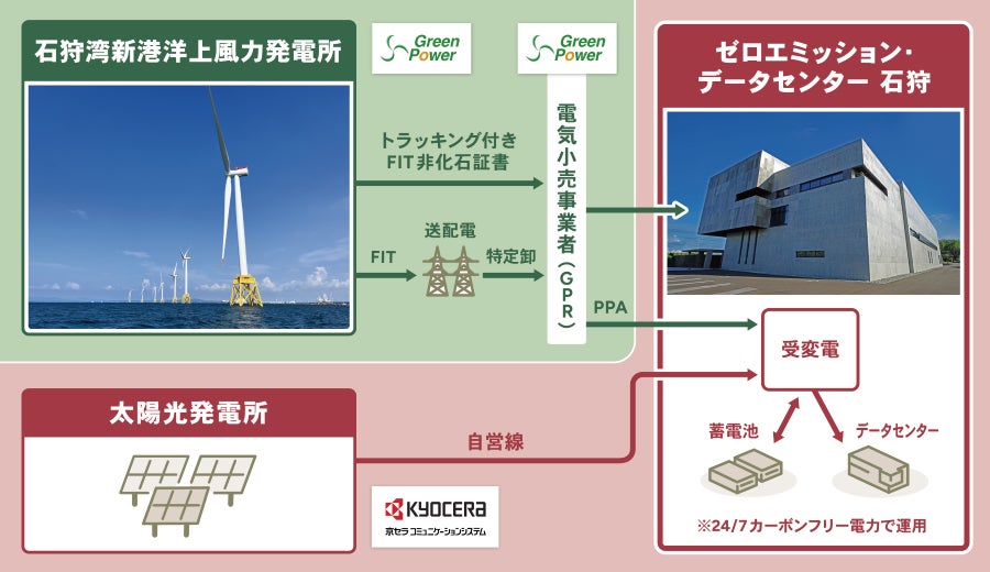 KCCSの「ゼロエミッション・データセンター 石狩(以下ZED石狩)」では、この洋上風力と近隣に建設した太陽光発電所の電力を、蓄電池と、AI技術によるタイムシフトなどの電力需給制御を行うことで、時間単位でのカーボンフリー電力のマッチングを可能にしました。これにより、データセンター事業として日本初(※1)となる「常時再エネ100%(24/7カーボンフリー電力(※2))」を事業開始の2024年10月より実装しています。この洋上風力とデータセンターの連携は、地域版GX・地域版DXを実現する先駆的な再エネ地産地消モデルとして評価いただきました。
