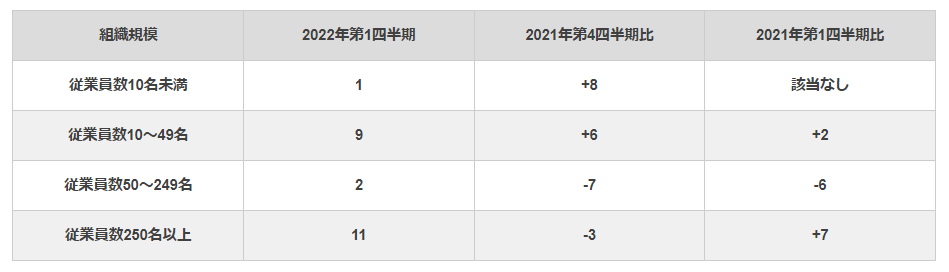 - 2022年第2四半期 組織規模別:全ての組織規模で増員予測