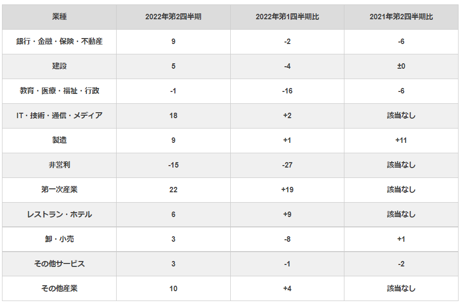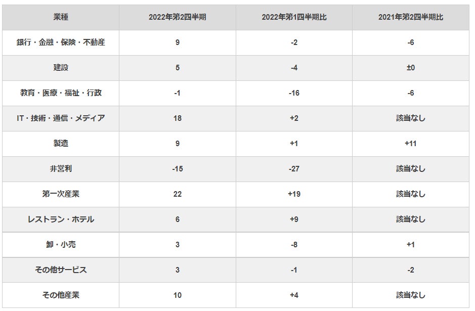 - 2022年第2四半期 業種別:11業種中、9種で増員予測