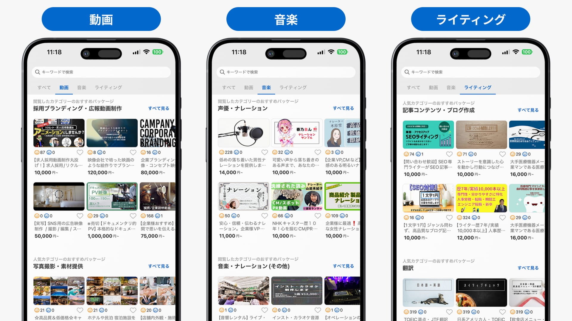 スーパーマーケットのように売り場と品揃えが明確になりました。「動画」「音楽」「ライティング」のように、カテゴリごとに商品が整理されているため、探している商品に最短距離で辿り着けます。カテゴリの拡張は今後も行っていきます。また、お目当てのものがない場合でも、人気の業種やカテゴリから探すことができ、欲しい商品に出会えるようになっています。