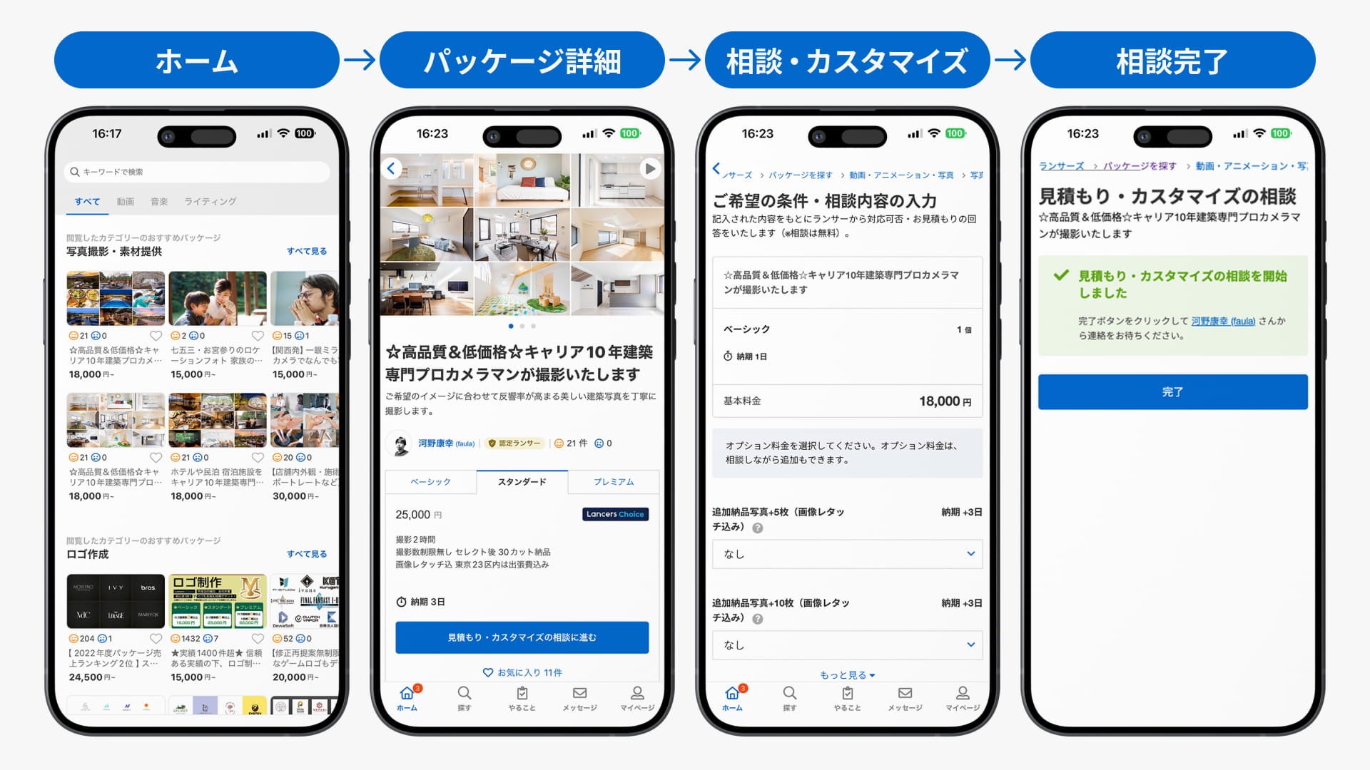 リニューアルにより、ランサーが提供内容を設定して出品するパッケージのおすすめや、実際の制作事例がホーム画面に表示されるため、目的に合った「今すぐ頼めるフリーランス」を簡単に見つけることができ、迅速なマッチングを実現します。これにより、移動中や隙間時間で、検索から相談・依頼までがアプリひとつで完結するため、特に、個人で店舗を経営・運営される方や、起業・開業を準備されている方々の「時間やスキルに制約があり、一人で手が回らない仕事を依頼したい」というニーズに応え、ビジネスが前進するための支援を行ってまいります。