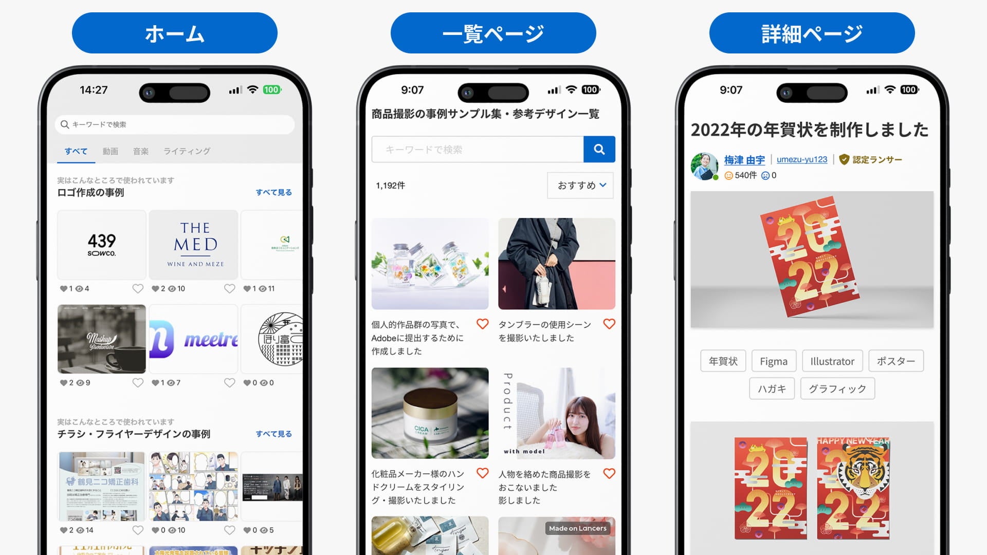 パッケージだけでなく、制作事例もアプリから閲覧可能になりました。発注者は充実した制作事例を閲覧し、よりイメージに合うクリエイターに依頼できます。クリエイターとして活動するランサーは制作事例を登録することで、仕事獲得の機会が広がります。