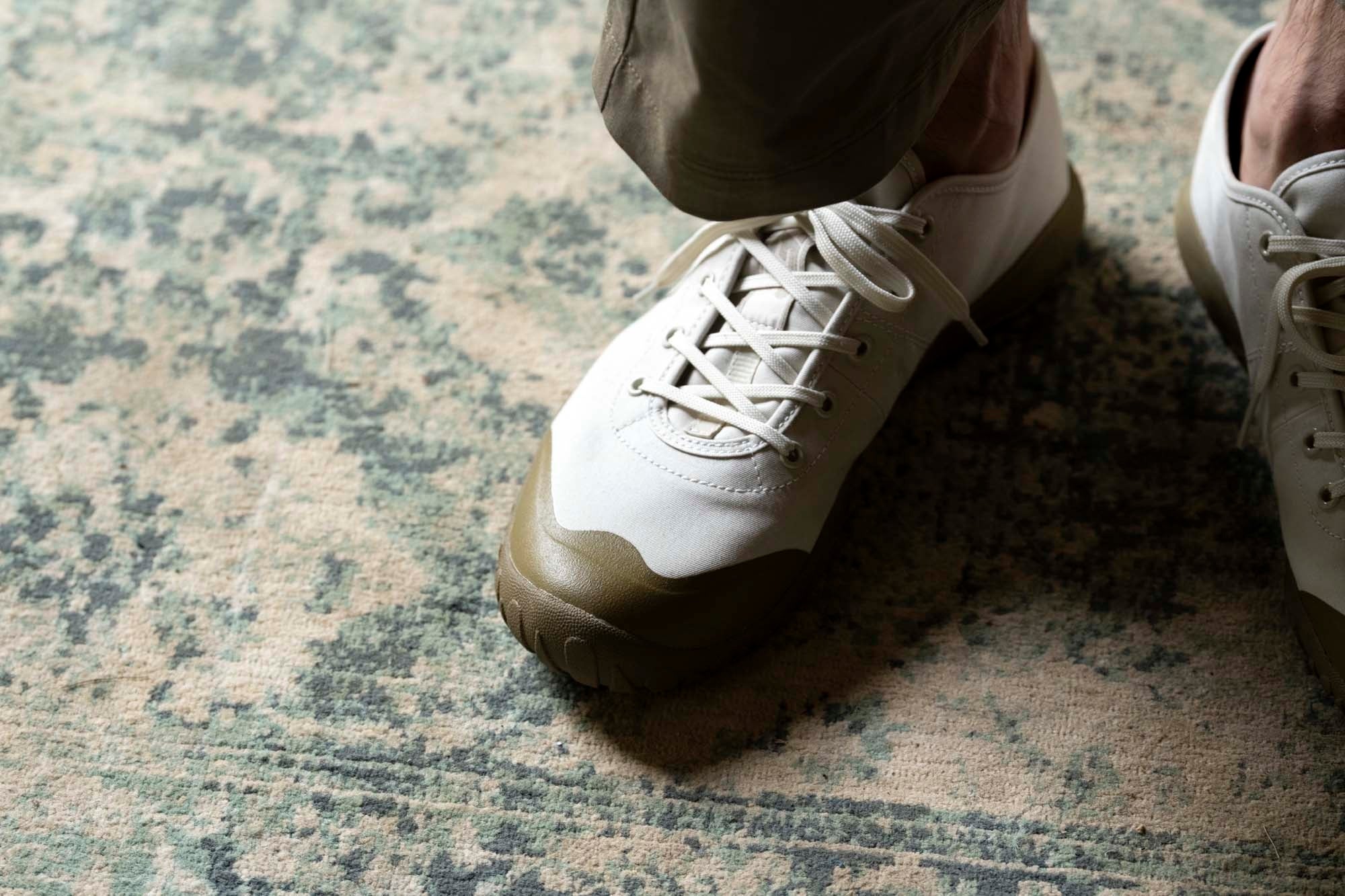 クラシカルな佇まいのレインスニーカーのロータイプ。綿素材でありながら撥水効果を実現した「ベンタイル」をアッパーに採用。ソールにはどこでも自由に動き回るカエルに着目し開発された防滑ラバー「GAMAHEX」を搭載。一般的なラバーに比べ、乾いた路面と濡れた路面での防滑性能の差が小さいという特徴を持ち、水辺や悪天時など路面の状態の影響を受けにくくなります。カジュアルな印象ながら、雨天時のレジャーシートなどでも充分な性能を発揮します。替え紐としてテントサイトなどでの着脱も容易になるゴム紐も付属。23SSシーズンでは定番カラーの「BLACK」「KHAKI」に加え、クリーンなホワイトカラー「OFFWHITE」が登場。
