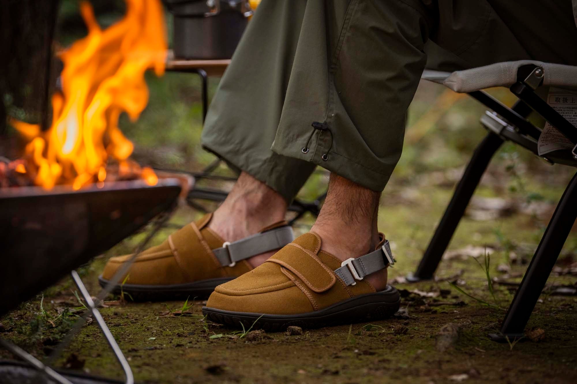 アイコニックなモカシンデザインの難燃クロッグサンダル。かかとベルトは取り外しができ、スライドサンダルとしても履くことが可能です。アッパーには火の粉が付いても燃え広がりにくい難燃素材を採用。焚火シーンで活躍するアイテムです。
