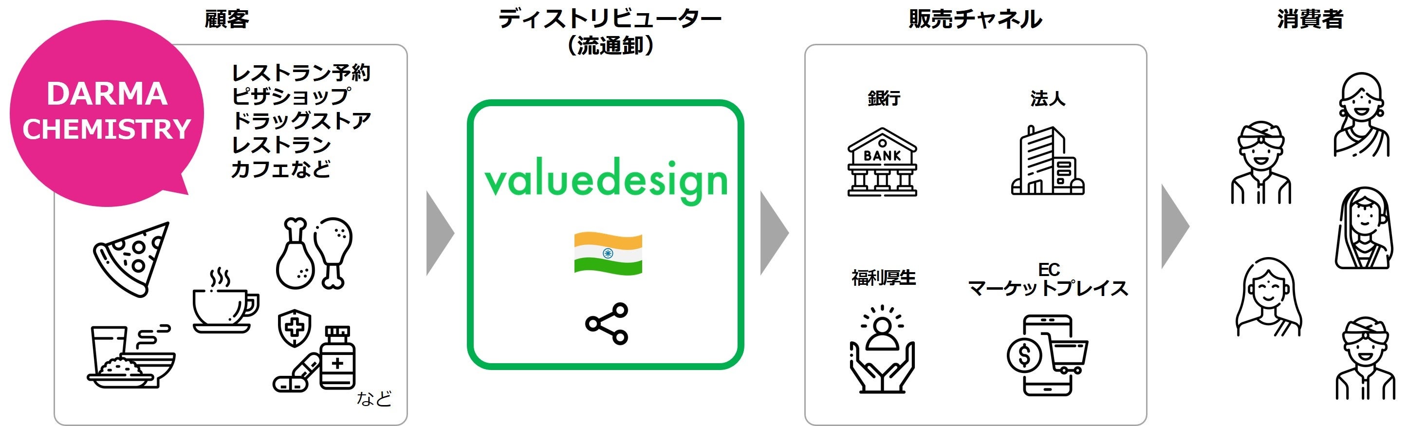 バリューデザインは、インド国内約 5 億人の消費者にアプローチ可能なディストリビューター8 社を介したネットワークを保有しています。ギフトカード発行企業を増やすことで消費者にとってのギフトの選択肢を増やし魅力を高めるととともに、代理店・販売チャネルを拡充することで、ギフトカード発行企業がより多くの消費者へリーチでき、ビジネスを拡大できるよう支援してまいります。