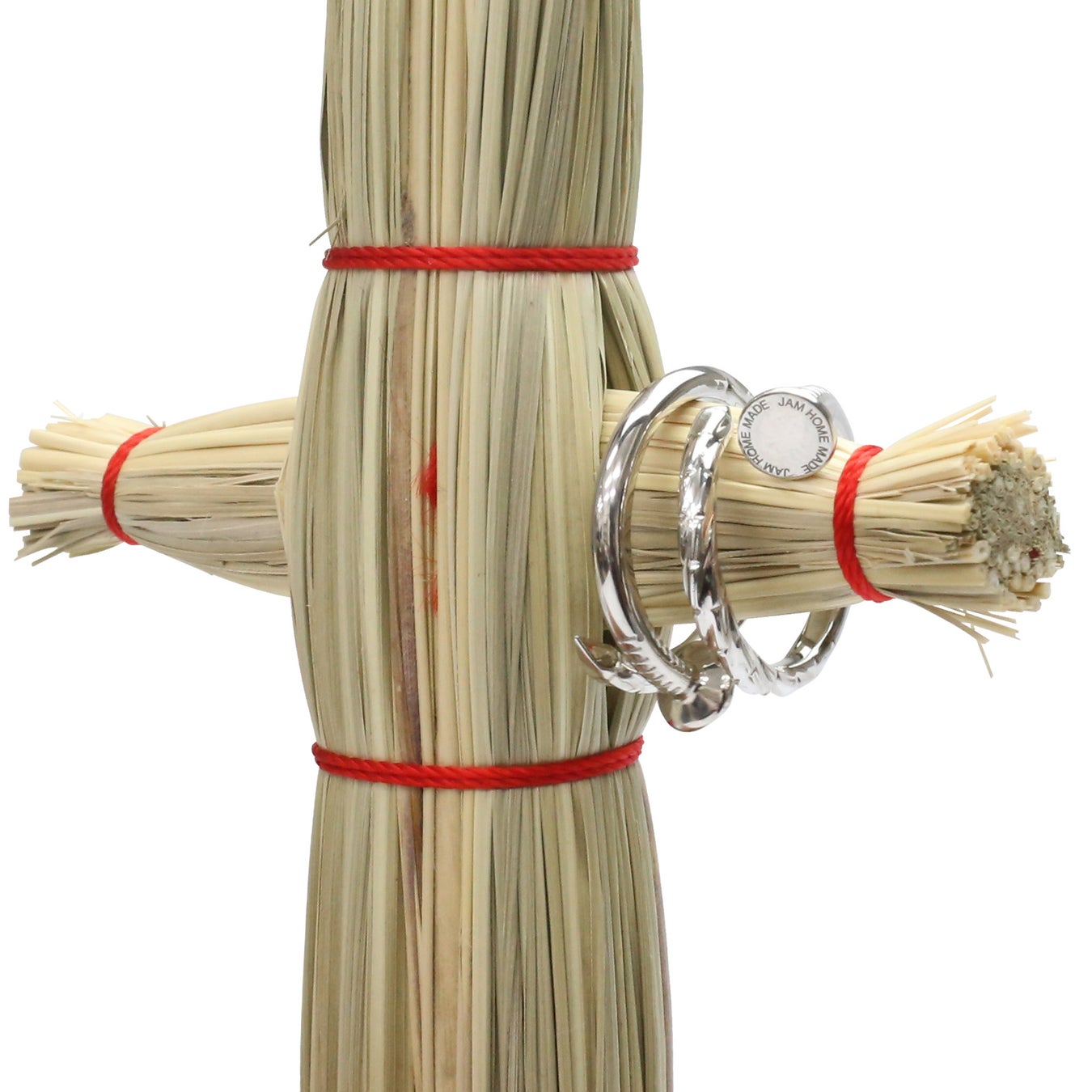 昨今の世の中を騒がせるニュースをPOPに提唱する、わら人形がセットになった、5寸釘をモチーフにしたフリーサイズのペアリングです。そもそも釘が曲がっているので呪うことが出来ません。また、実際の呪術着手の儀式は、至極特殊な装いをして丑三つ時に7日間、誰にも見られることなく、御神木にわら人形を五寸釘で打ち込むという非常にハードルが高いもの。釘がまっすぐであっても呪術行使は困難です。そのような呪術なんて必要ない二人。決して、責めない、呪わない指輪です。