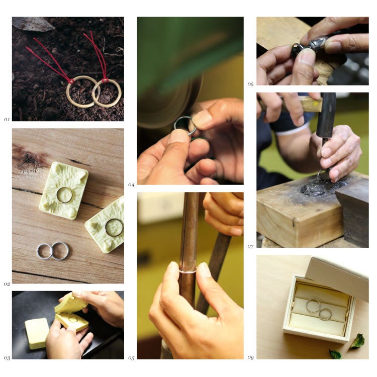 そして自分たちで作った“名もなき指輪”を原型として型にとり、プラチナやゴールドで造りかえ、結婚指輪として生まれ変わらせることができます。作るときについた叩き跡や日々の生活の中で纏った傷跡、その思い出ごとかたどり、叩いて作ったその日から二人で過ごした時間、それがそのまま刻まれた“世界にひとつだけの指輪”に。新しい価値観の次世代型指輪です。