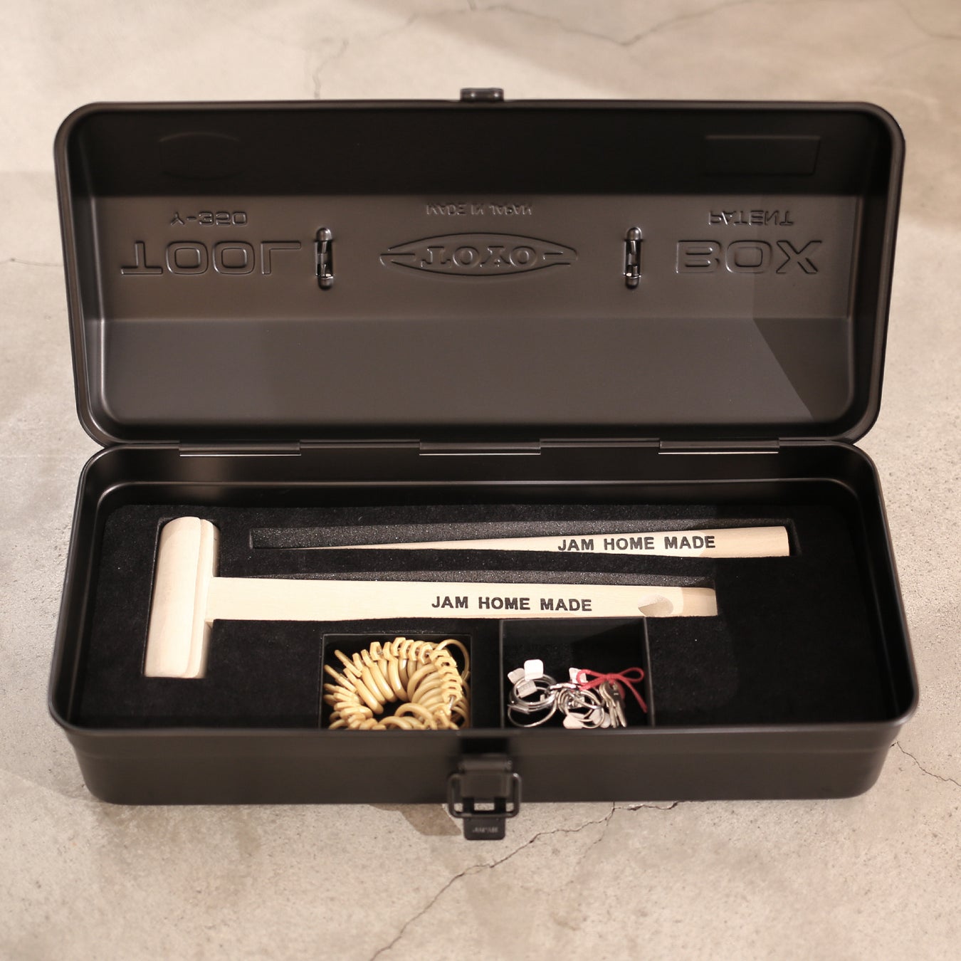 東洋スチールは1969年創業の、世界で初めて一枚の鋼板から継ぎ目のない深絞り技術でスチール製のツールボックスを完成させたメーカーです。シンプルで頑丈、無骨ながらも美しいその工具箱はMADE IN JAPANのクオリティでグッドデザイン賞、ロングライフデザイン賞などを受賞し、半世紀以上愛され続けています。TOYO STEELの代表作『山型工具箱』と、『名もなき指輪®』のグッドデザイン受賞プロダクト同志のジャムセッションです。