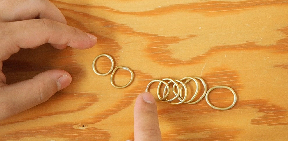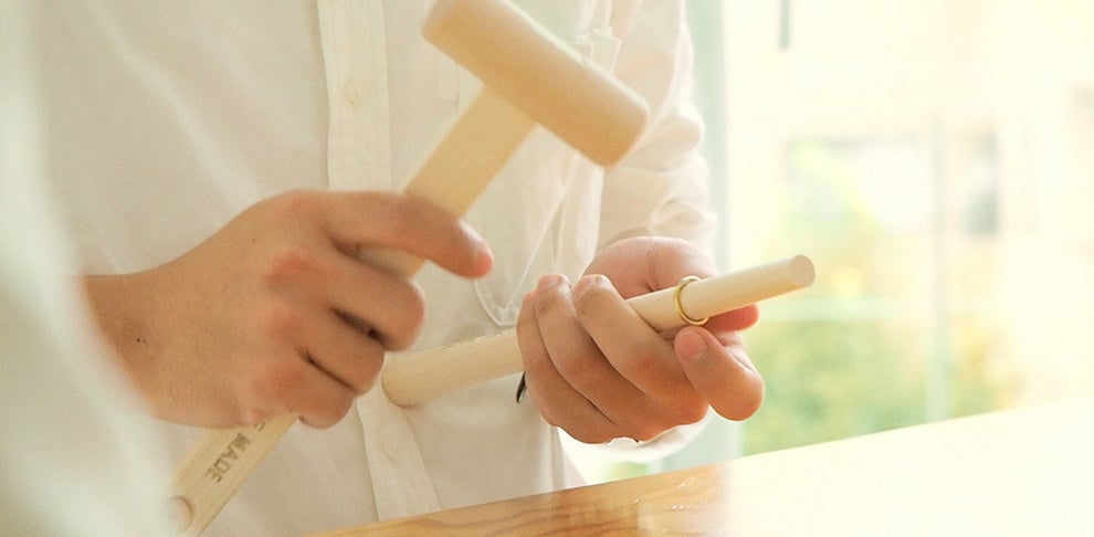 楕円にゆがんだ真鍮のリングを芯棒に通し、木槌でたたいて真円に仕立て上げる手づくりの指輪。サイズ対応が可能なリングセットと、指のサイズを測るリングゲージなど製作に必要な道具が一緒にパッケージングされているので、いつでもどこでも誰とでも指輪づくりが体験できます。『名もなき指輪®』製作に使った芯棒と木槌は、使用後フォトスタンドに組み立てることができます。