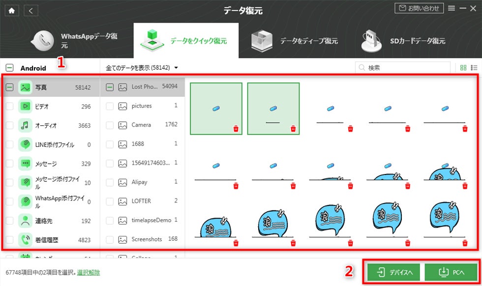 Step 3: 復元したいデータを選択、「デバイスへ」または「PCへ」をクリックします。