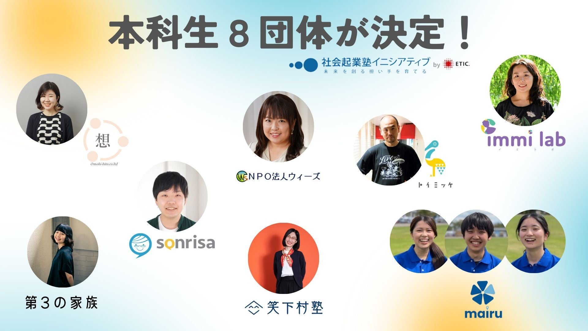今年度は、書類選考を通過した16団体のうち、以下の8団体が本科プログラムに参加します。採択メンバーは今後、約6ヶ月にわたるメンタリングや伴走支援を通じて、社会を変える事業や計画づくり、経営者としてのマインドを身につけます。