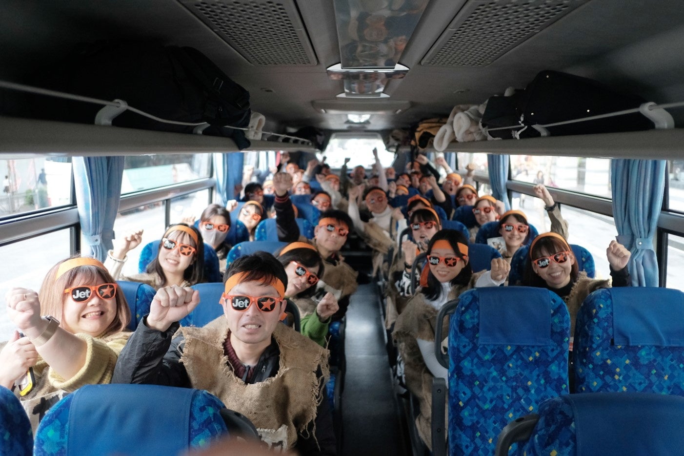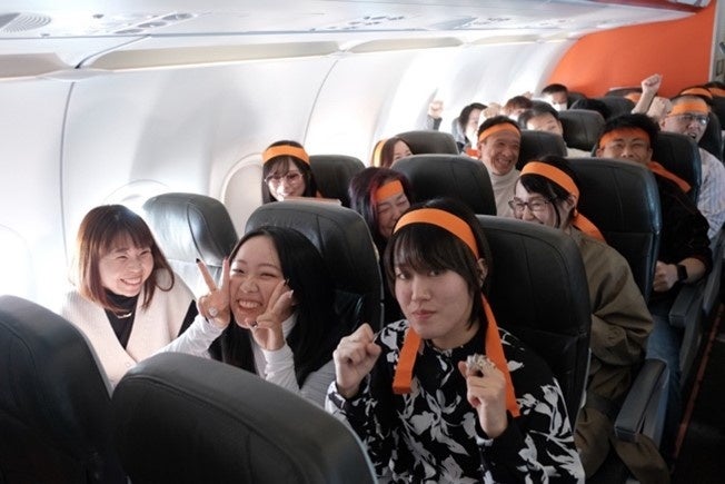 「ファンタジーな旅へ、いざ出陣じゃー!」機内で記念撮影