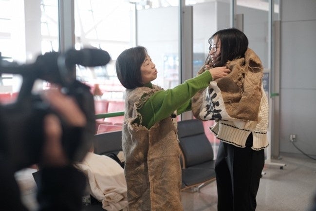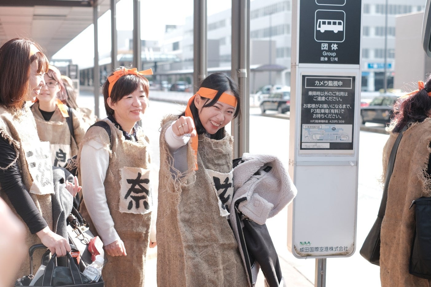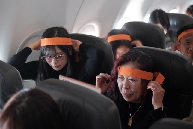 成田に到着した参加者は、作品に登場する“解放戦線メンバー”風のコスチュームを身にまとい、映画の出演者になった気分で空港に降り立ちました。そこに、京都市長役で本作品に出演している川﨑麻世さんがまさかの登場。「映画の中では、3県をちょっとディスるところもありますが、この映画の面白い部分なのでご了承ください(笑)。今日は一日楽しんでいただきたいと思います!」と話し、参加者はまさかの登場に大いに驚きながら、搭乗してきた飛行機の前で記念撮影を行いました。