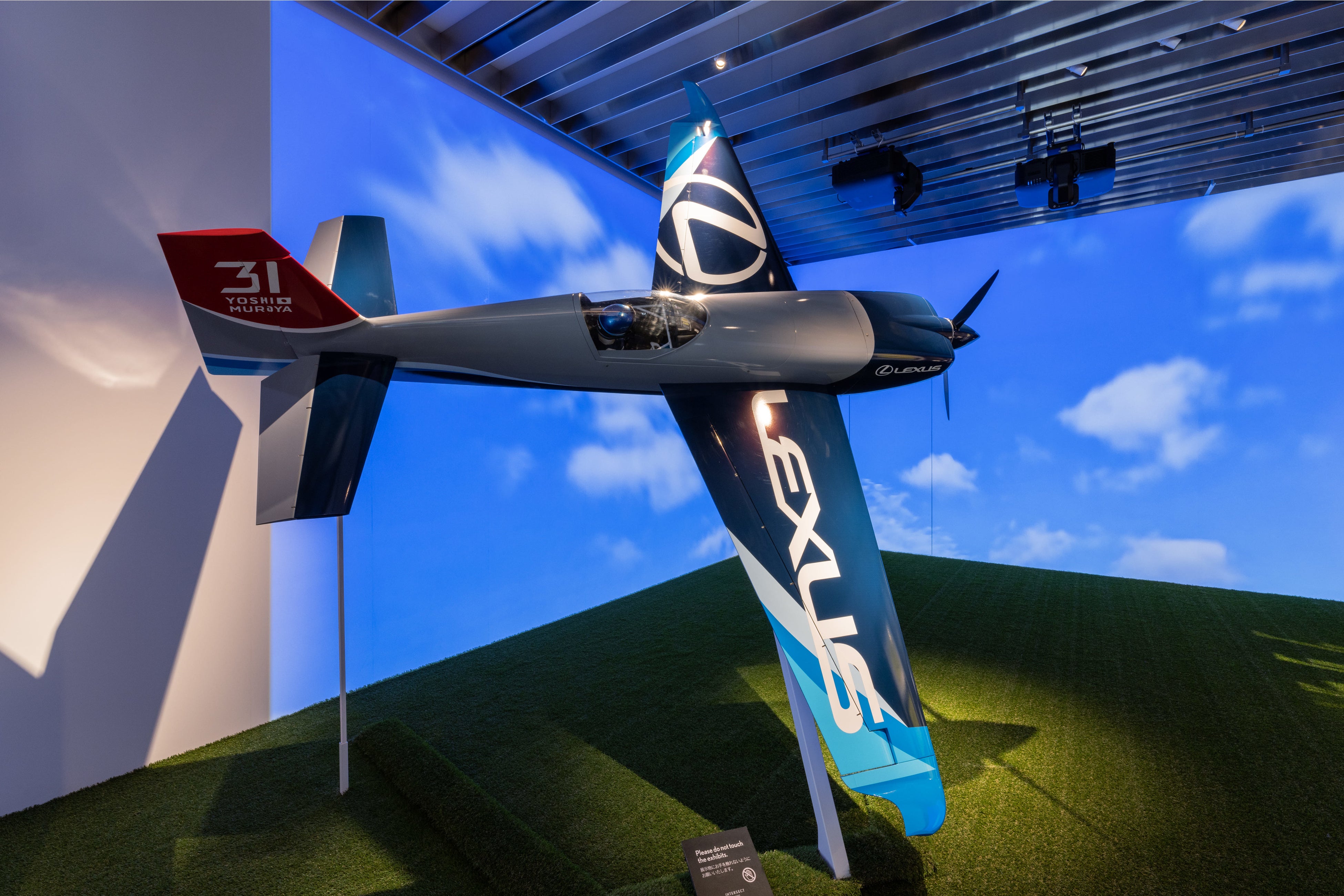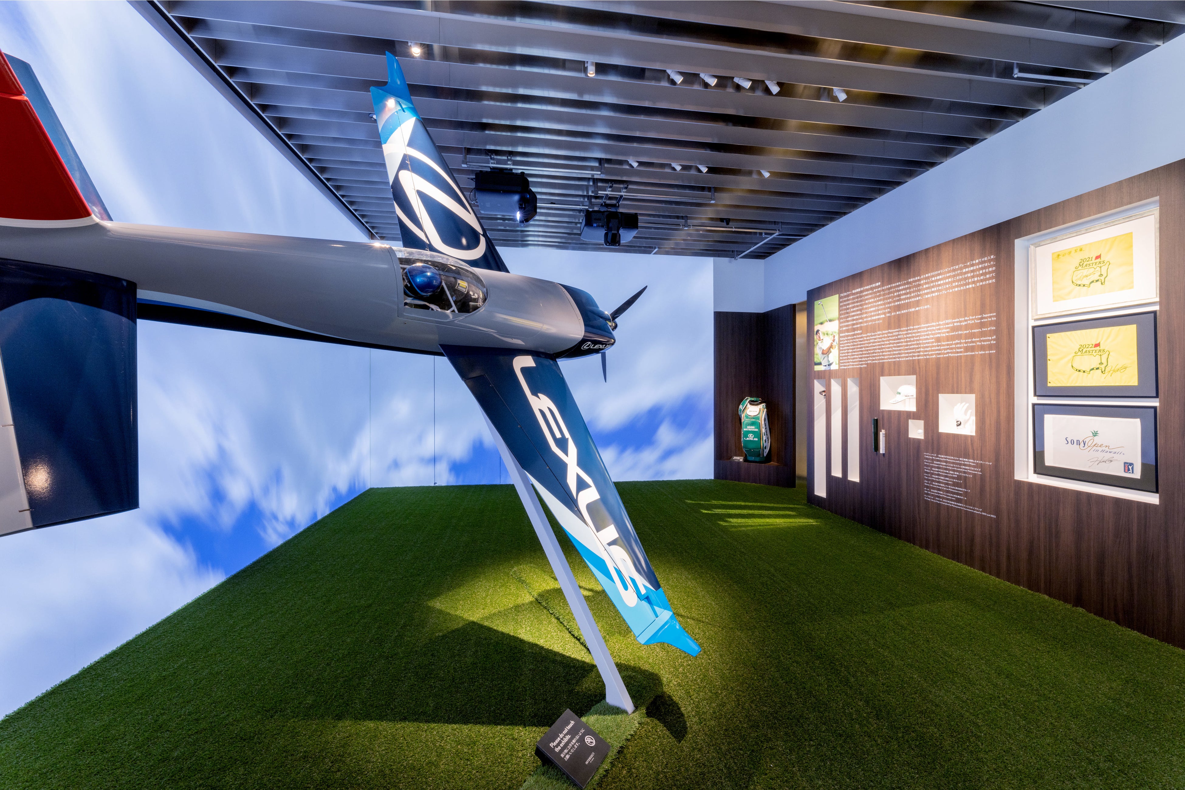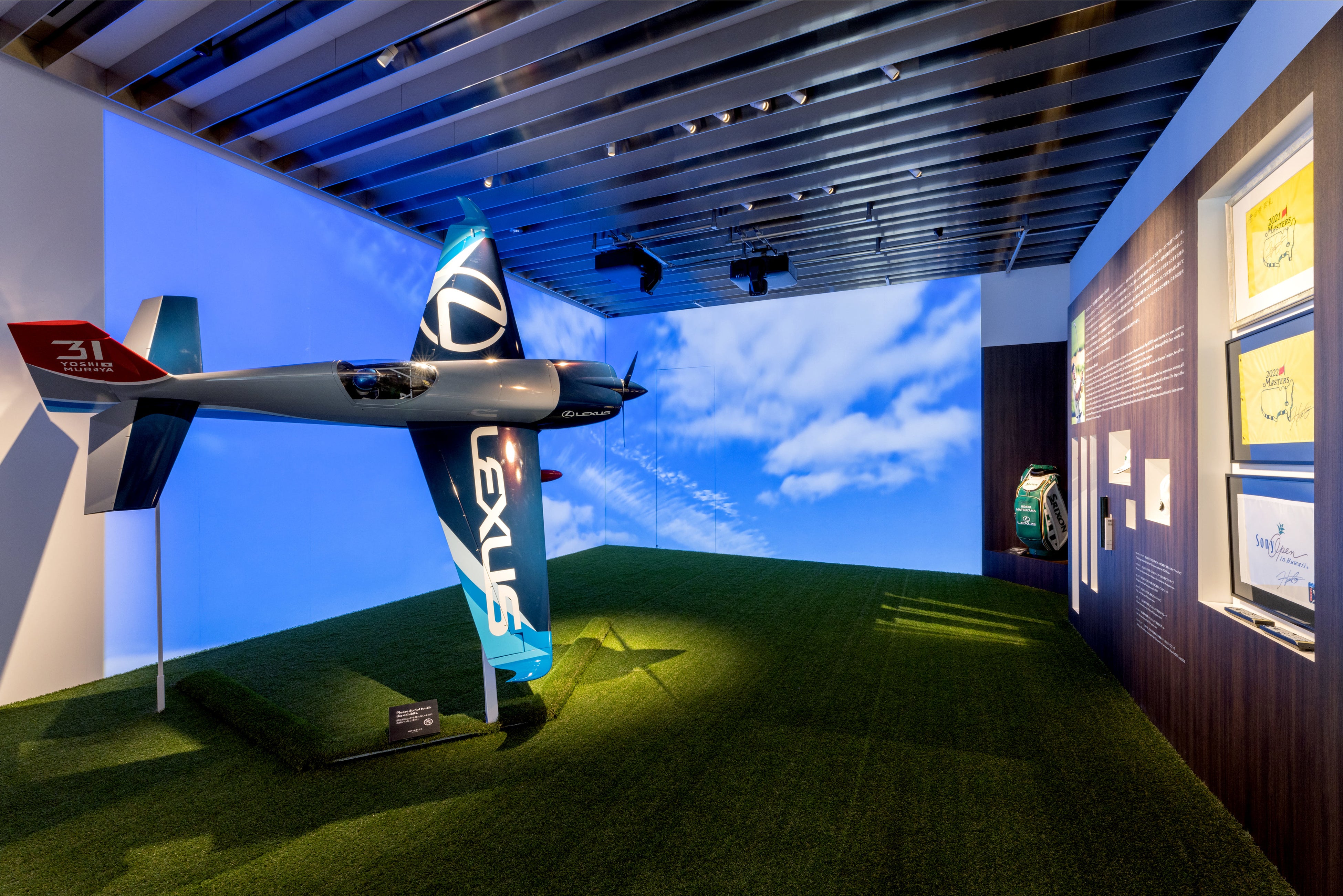 両選手の活躍の舞台であるゴルフ場のグリーンと、大空の青をイメージした空間で、それぞれにゆかりのある品を展示しています。松山選手が今年のメジャー戦で使用したキャディーバックや、選手が実際に使ったウェッジ、道具に対する繊細な感覚とこだわりが詰まった選手仕様のドライバーなど、他では見られないものばかりです。また、究極の三次元モータースポーツと呼ばれるエアレースで室屋選手が操縦する機体のカラーリングやレーシングパーツを細部に拘って模した全幅3mの機体モデルと、フライト中の室屋選手視点の映像をご覧いただけます。