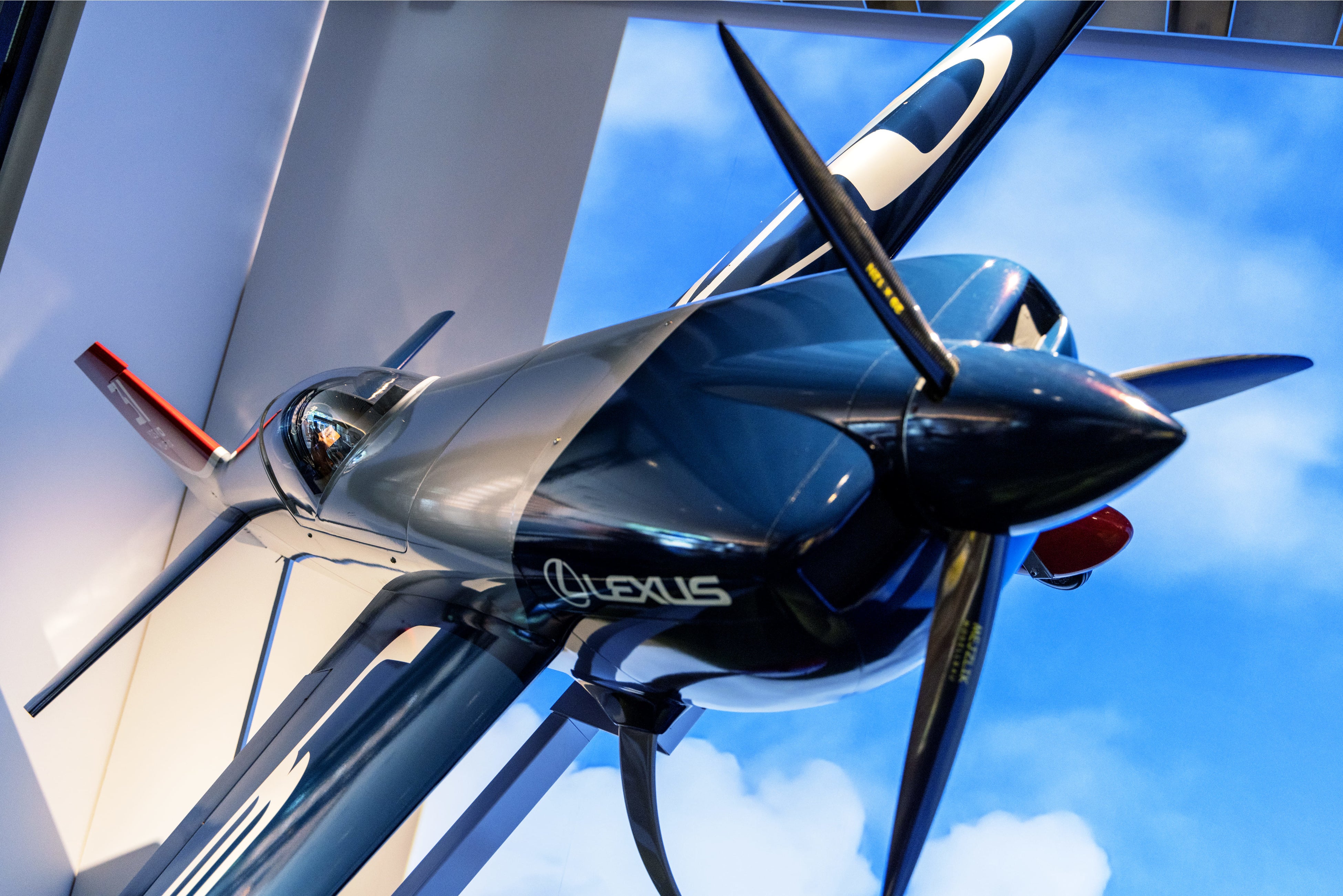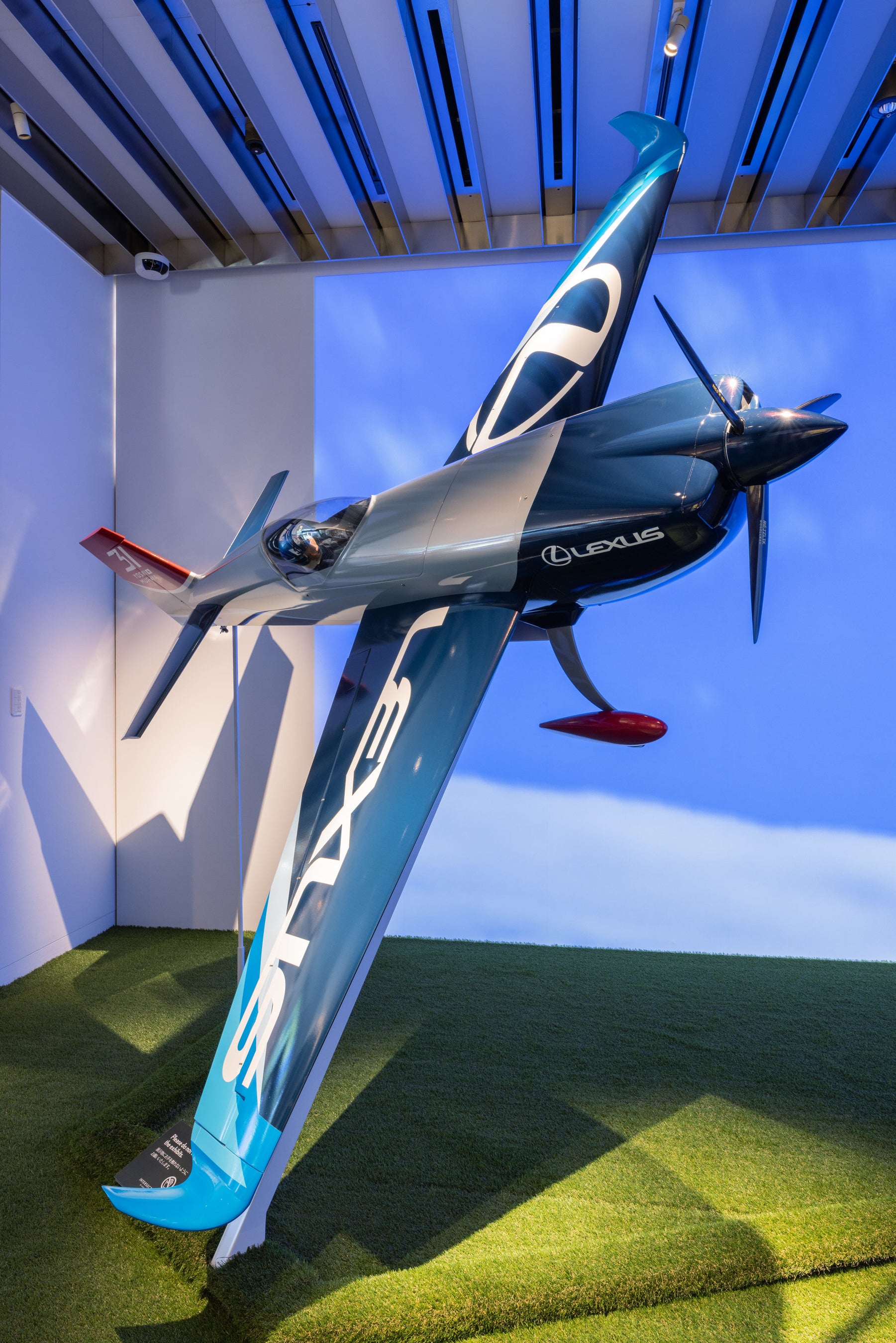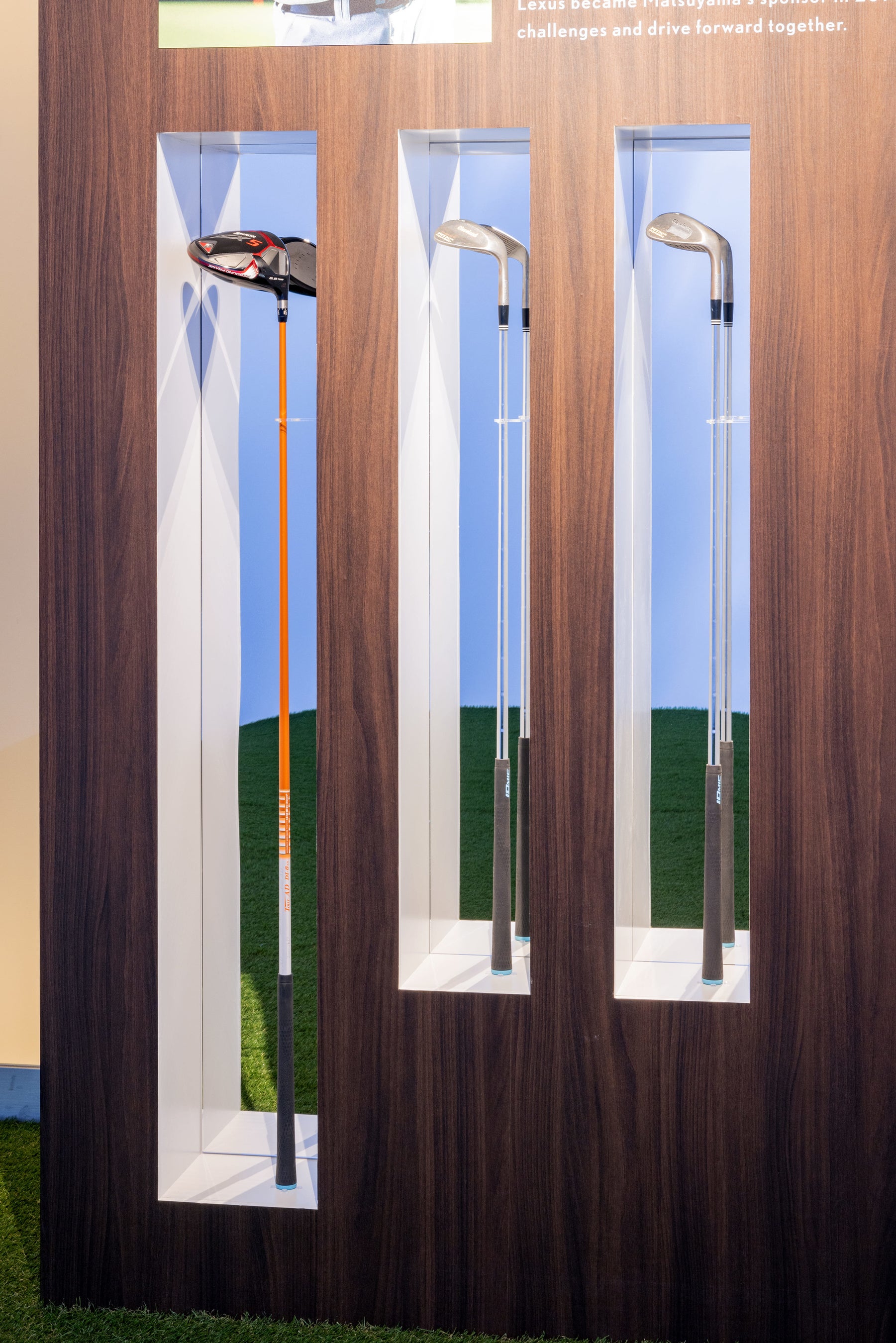 両選手の活躍の舞台であるゴルフ場のグリーンと、大空の青をイメージした空間で、それぞれにゆかりのある品を展示しています。松山選手が今年のメジャー戦で使用したキャディーバックや、選手が実際に使ったウェッジ、道具に対する繊細な感覚とこだわりが詰まった選手仕様のドライバーなど、他では見られないものばかりです。また、究極の三次元モータースポーツと呼ばれるエアレースで室屋選手が操縦する機体のカラーリングやレーシングパーツを細部に拘って模した全幅3mの機体モデルと、フライト中の室屋選手視点の映像をご覧いただけます。