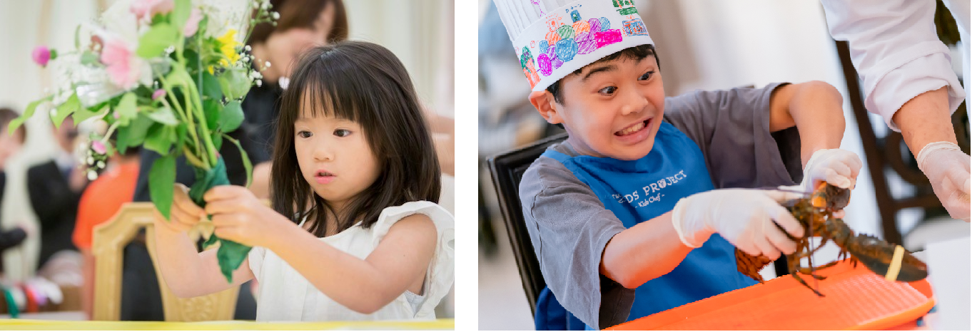 婚式場のシェフと一緒に、子どもたちがご家族に向けて料理を作ります。「想いを込めて料理を作ること」「衛生問題」について学び、社会問題である「フードロス」削減のためにできることなど、身近な問題を考えるきっかけも提供。地域の特産品を使ったメニューの調理、オマール海老や魚を捌く体験を通して「食べ物への感謝」「命の大切さ」を学べるプログラムも実施します。